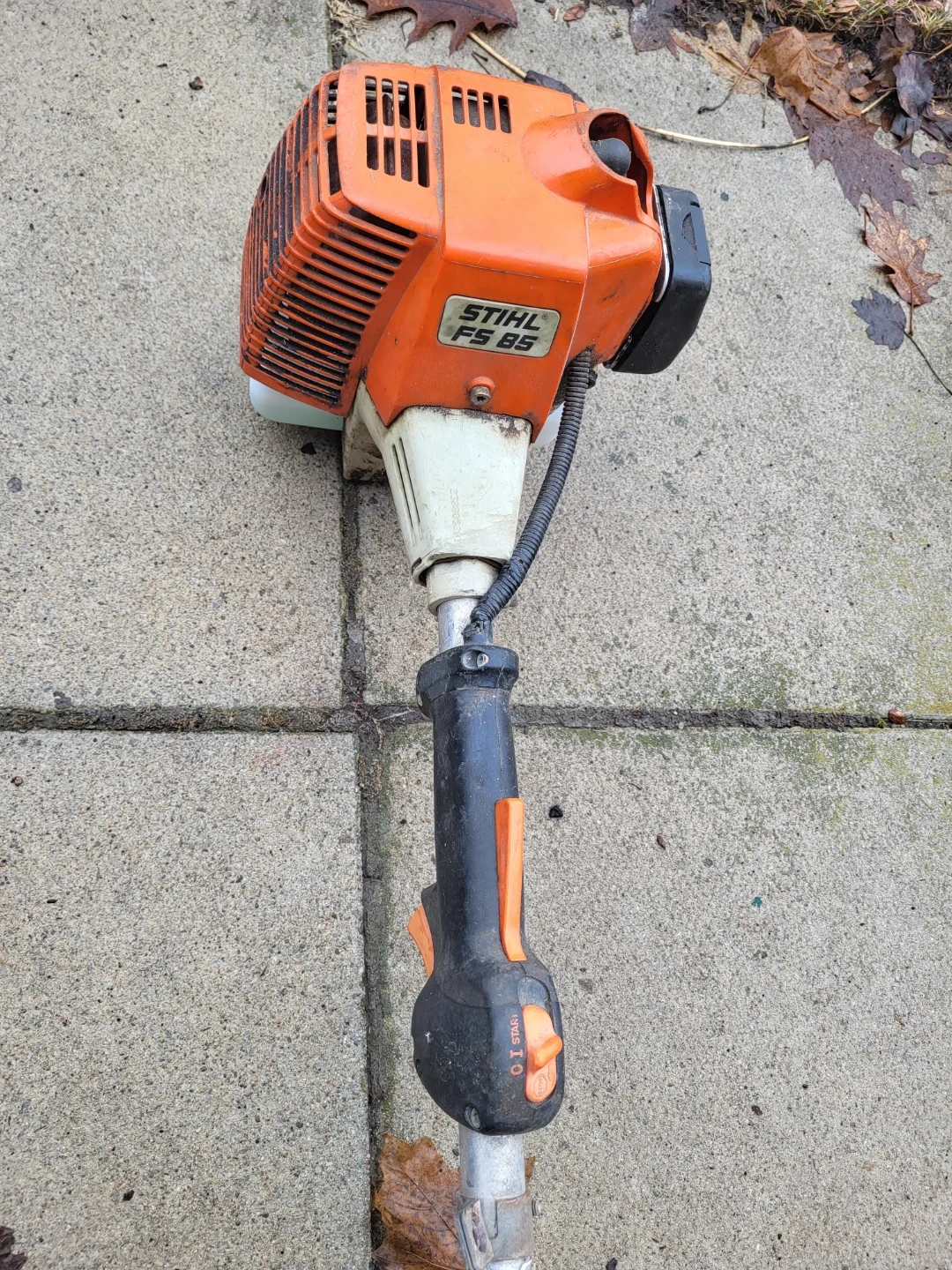 This is a STIHL FS 85 gas-powered string trimmer. It features a powerful engine for tackling yard work. This trimmer's design makes it suitable for trimming around obstacles and edges.