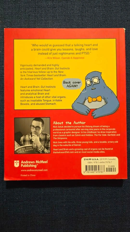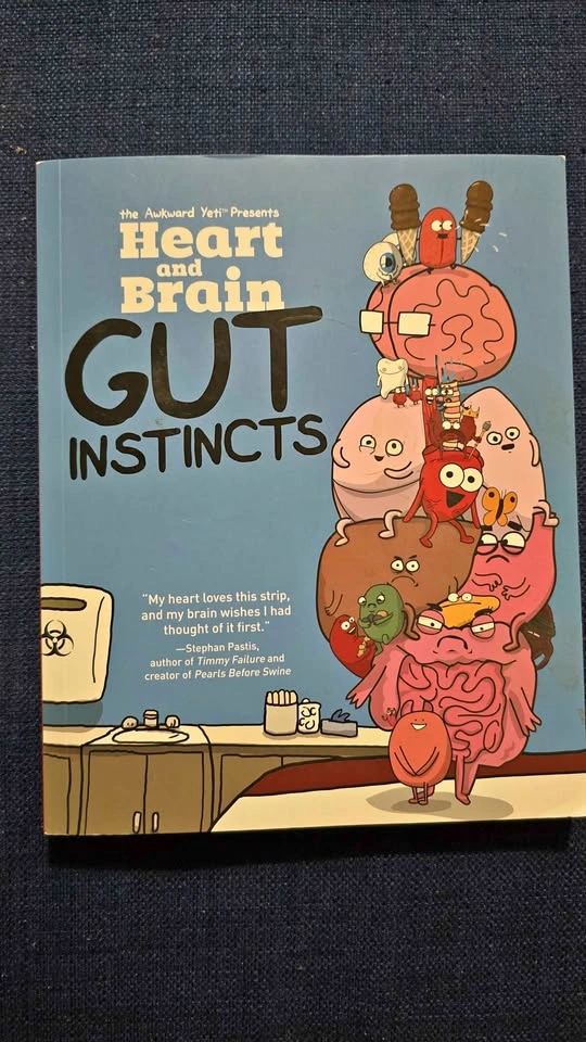 Hilarious Awkward Yeti book, Heart and Brain Gut Instincts. This graphic novel has the emotional Heart and analytical Brain characters, plus other organs. No rips or tears.