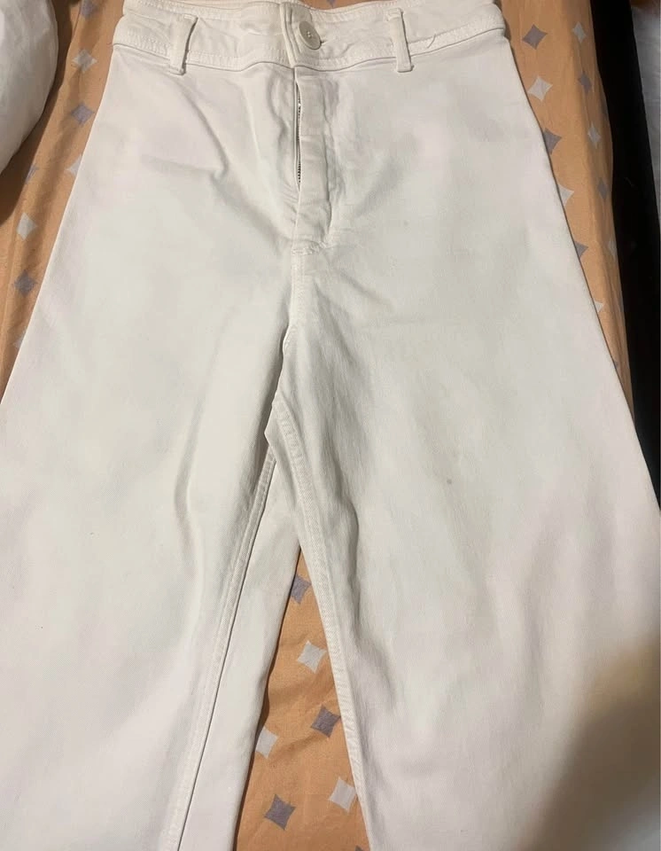 White Zara pants in like new condition, worn only about 5 times. There is a small minor stain near the pocket area, but it should come out with a stain remover. No other stains or damage. Selling because I bought a new pair and no longer need these. Smoke-free & pet-free home. Modern fit, versatile for casual or dressy outfits. Pick-up near Metrotown :)!