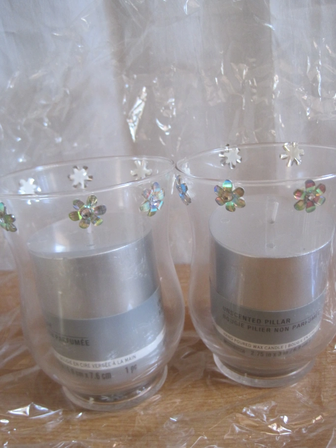 ✅️Two wrapped, new unscented pillar candles in glass candle holders decorated with silver and iridescent sequins. Each candle is 2.75" in diameter.