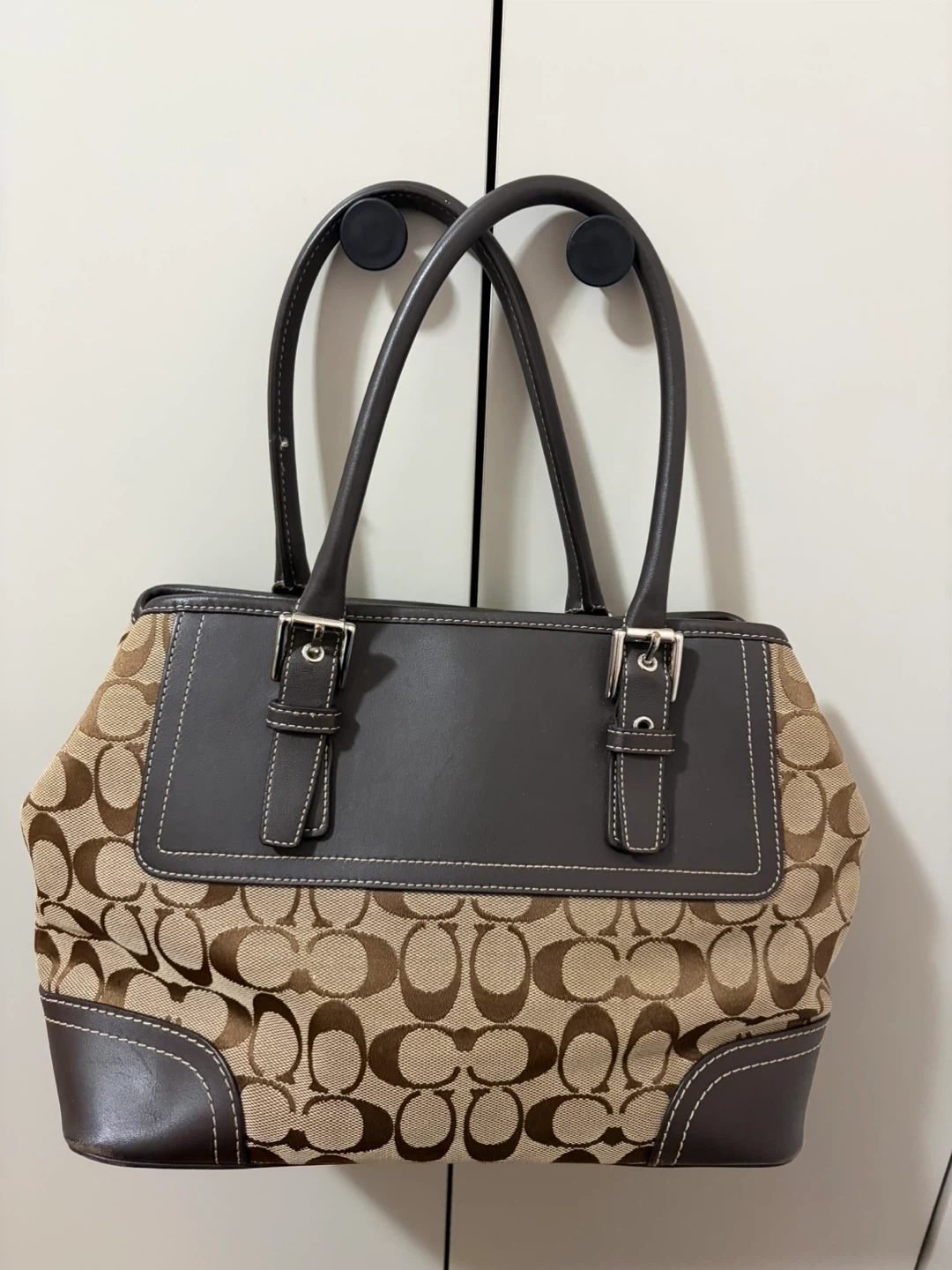 Classic Coach monogram canvas handbag with dark brown leather trim and handles. It features the signature Coach "C" pattern and silver-tone hardware. This bag was handcrafted in India from fine materials, reflecting superior craftsmanship. It's a stylish accessory for everyday use.