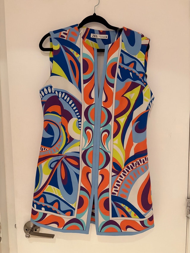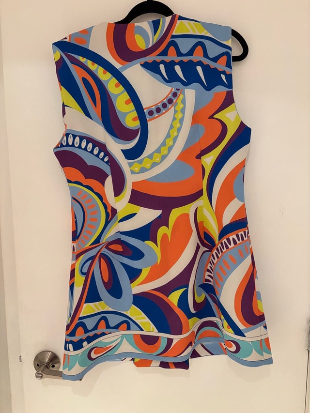 Eye-catching sleeveless dress with a bold multicolor design. Perfect for a stylish statement. Only worn a few times and in fantastic quality. Cash accepted.