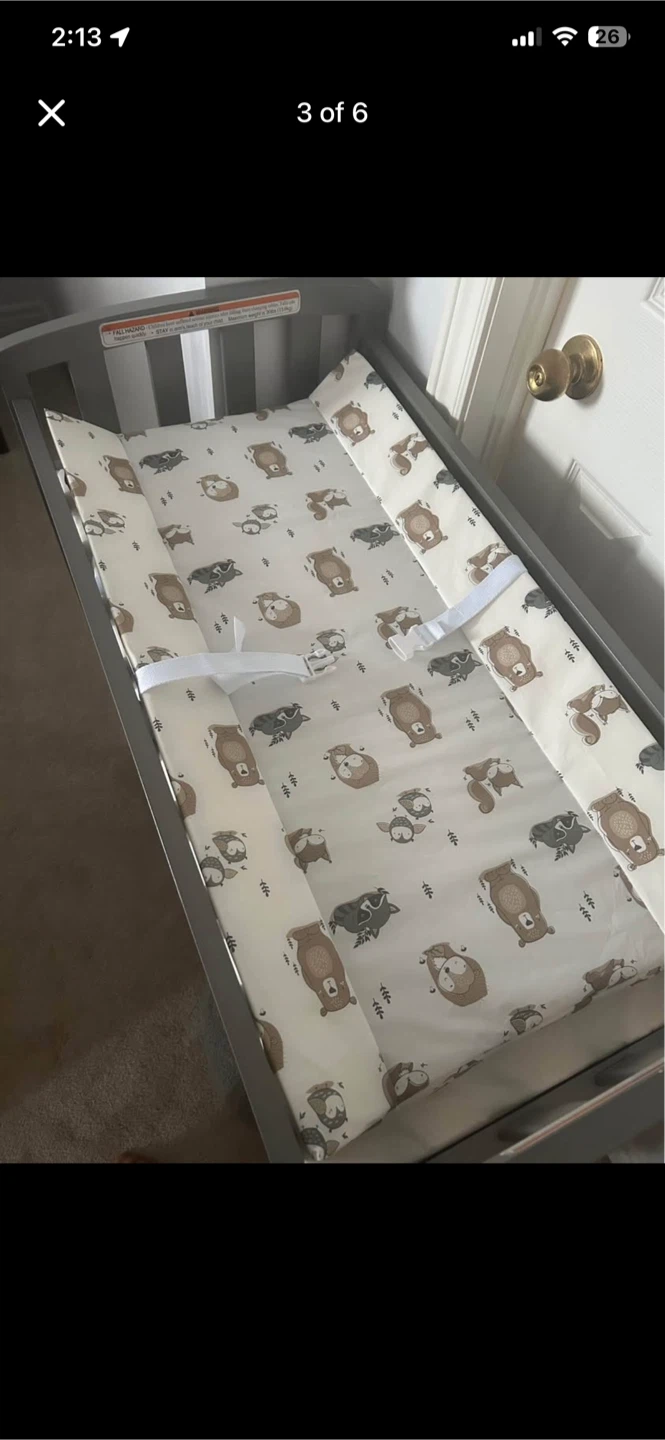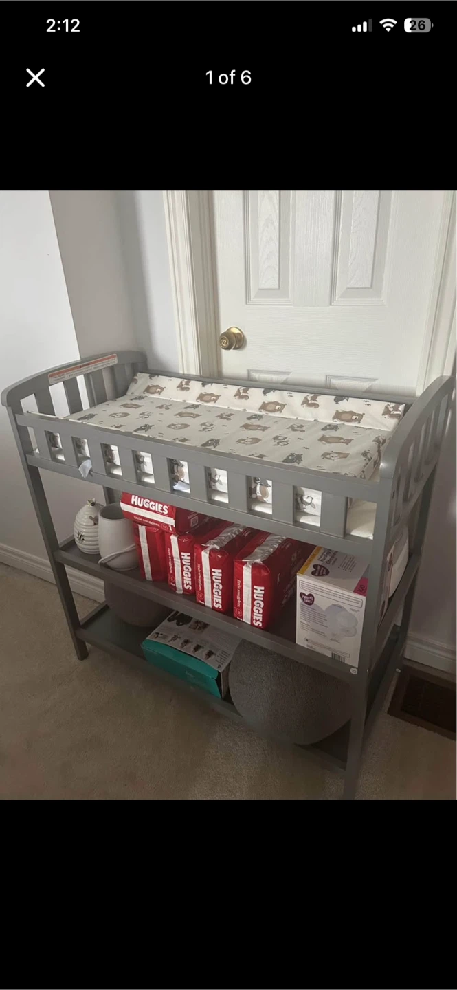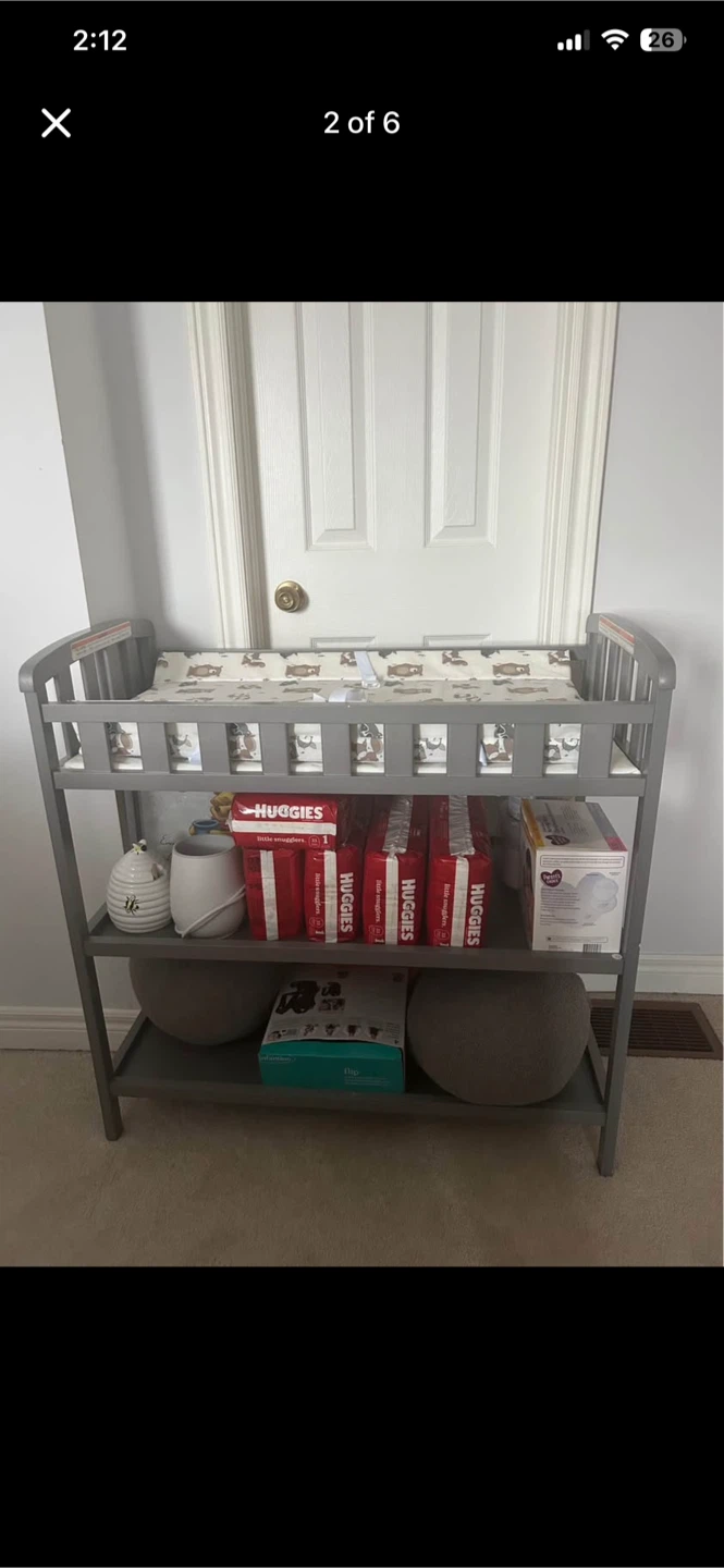 Selling a grey baby changing table. It has a changing pad on top with a cute animal print. There's also shelving underneath for storing diapers and other baby essentials