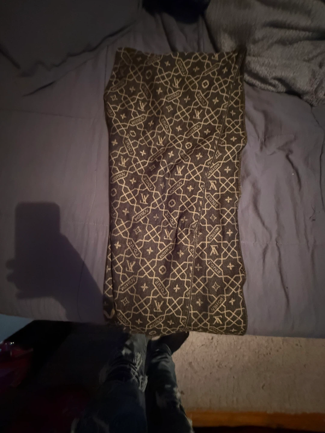 Selling a Louis Vuitton scarf. It features the classic LV monogram pattern. The scarf is in good condition and ready to keep you warm!