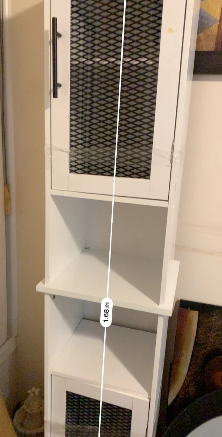 A tall, white storage cabinet with a modern design. It stands 1.68 meters tall and features two cabinets with mesh doors and open shelving. This unit provides ample storage for various items.