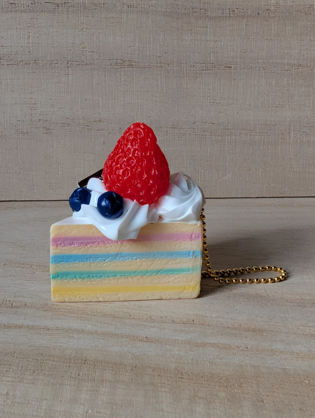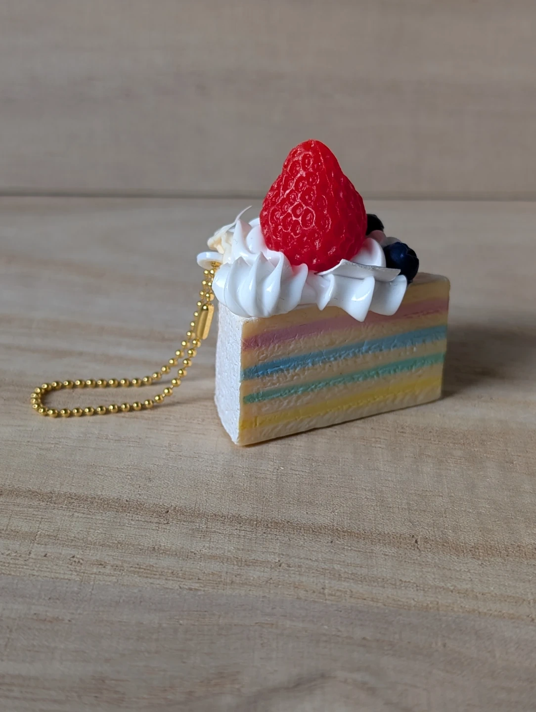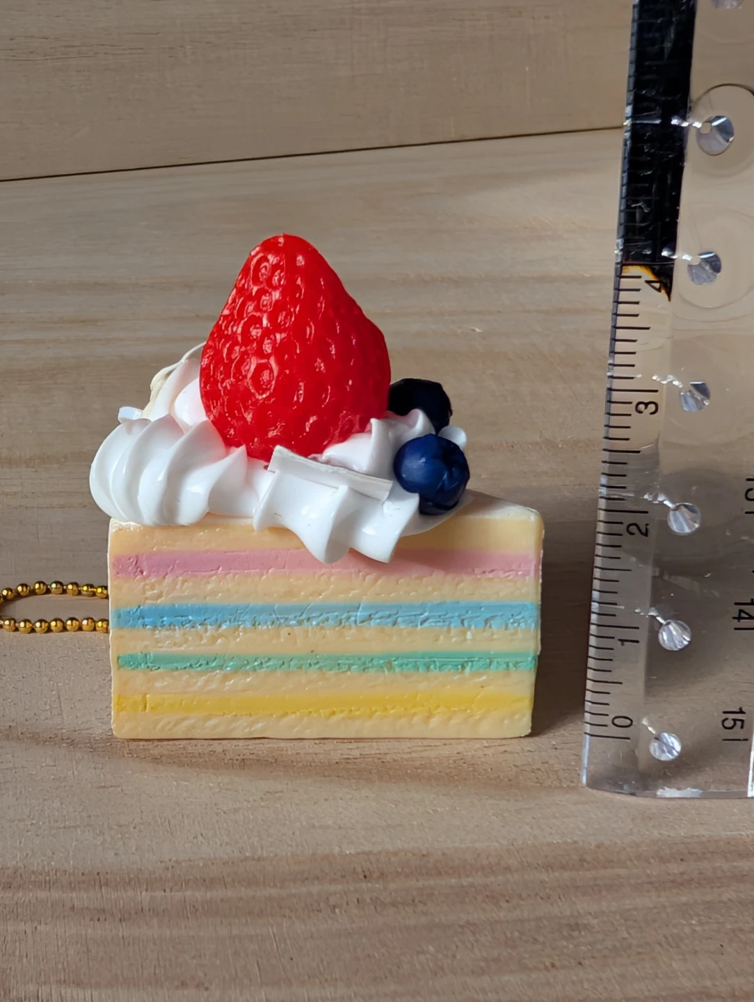 This is a cute rainbow cake slice charm. It features colourful layers, whipped cream, a strawberry, and two blueberries on top. It's about 2.5 inches tall and has a gold ball chain. Makes a sweet little accessory!