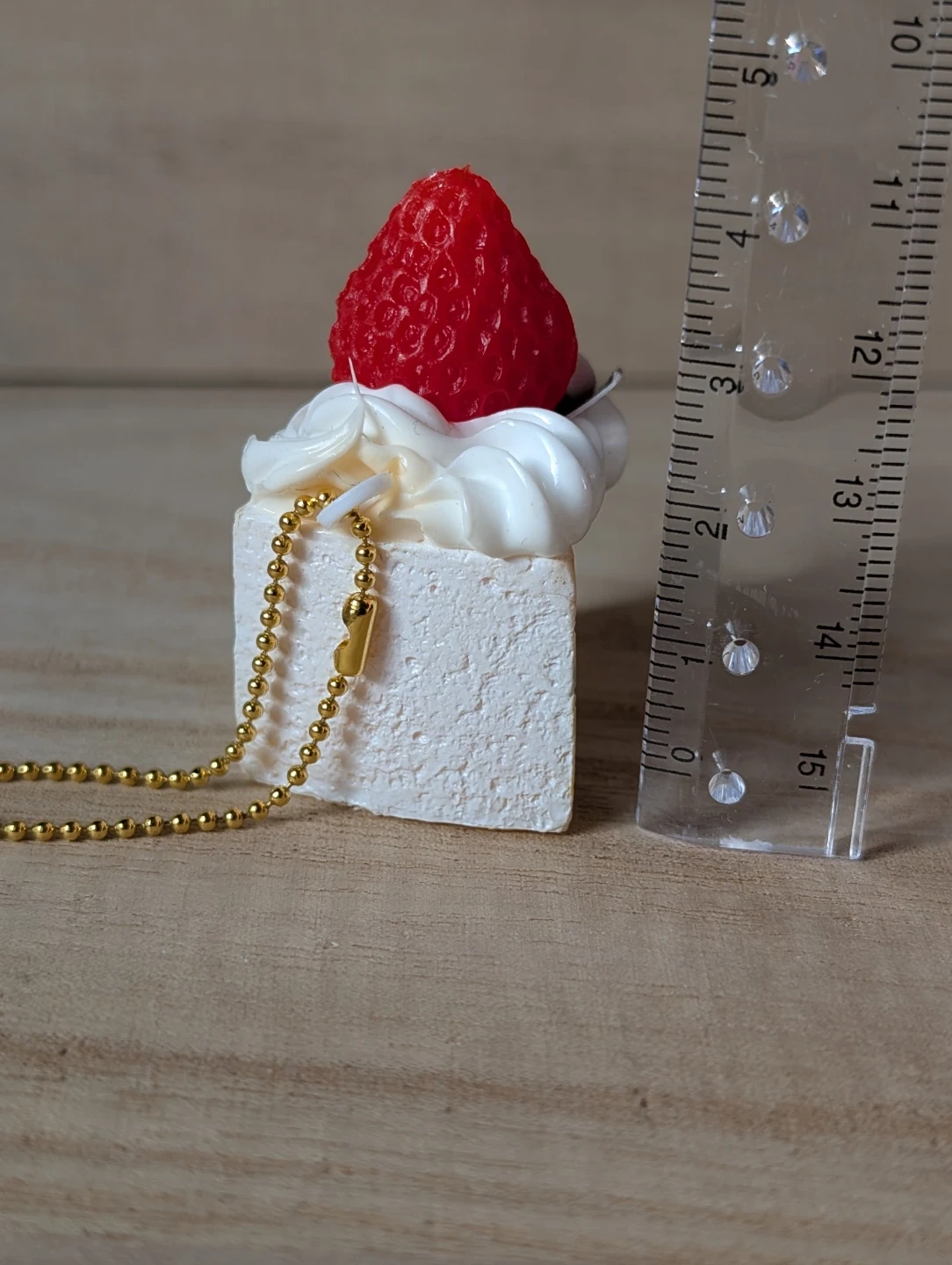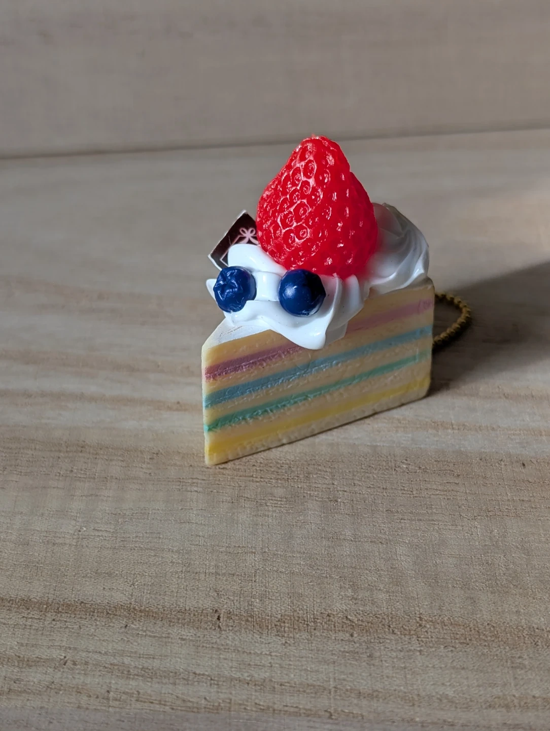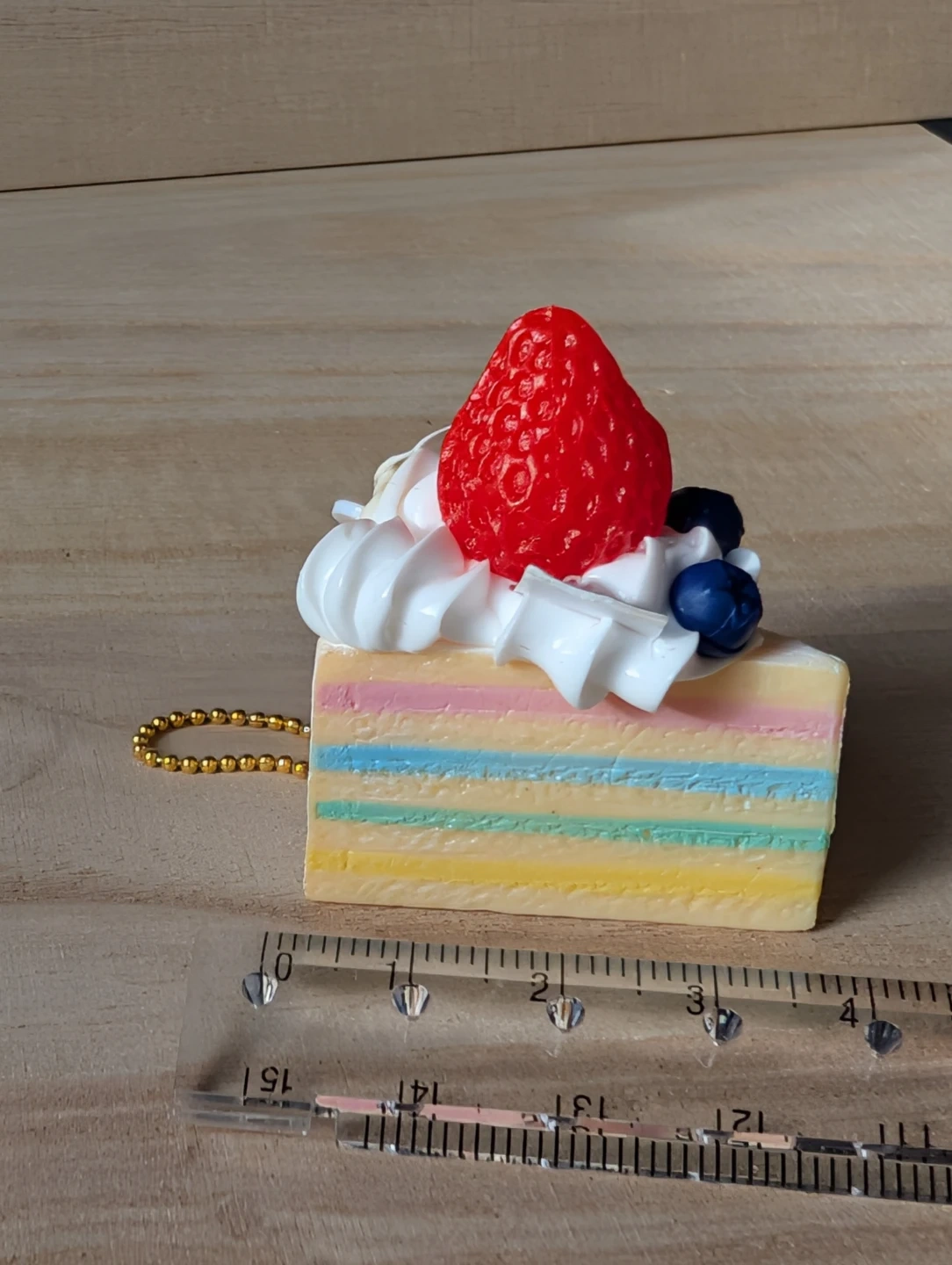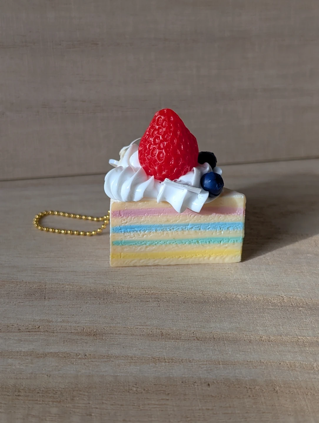 This is a cute rainbow cake slice charm. It features colourful layers, whipped cream, a strawberry, and two blueberries on top. It's about 2.5 inches tall and has a gold ball chain. Makes a sweet little accessory!