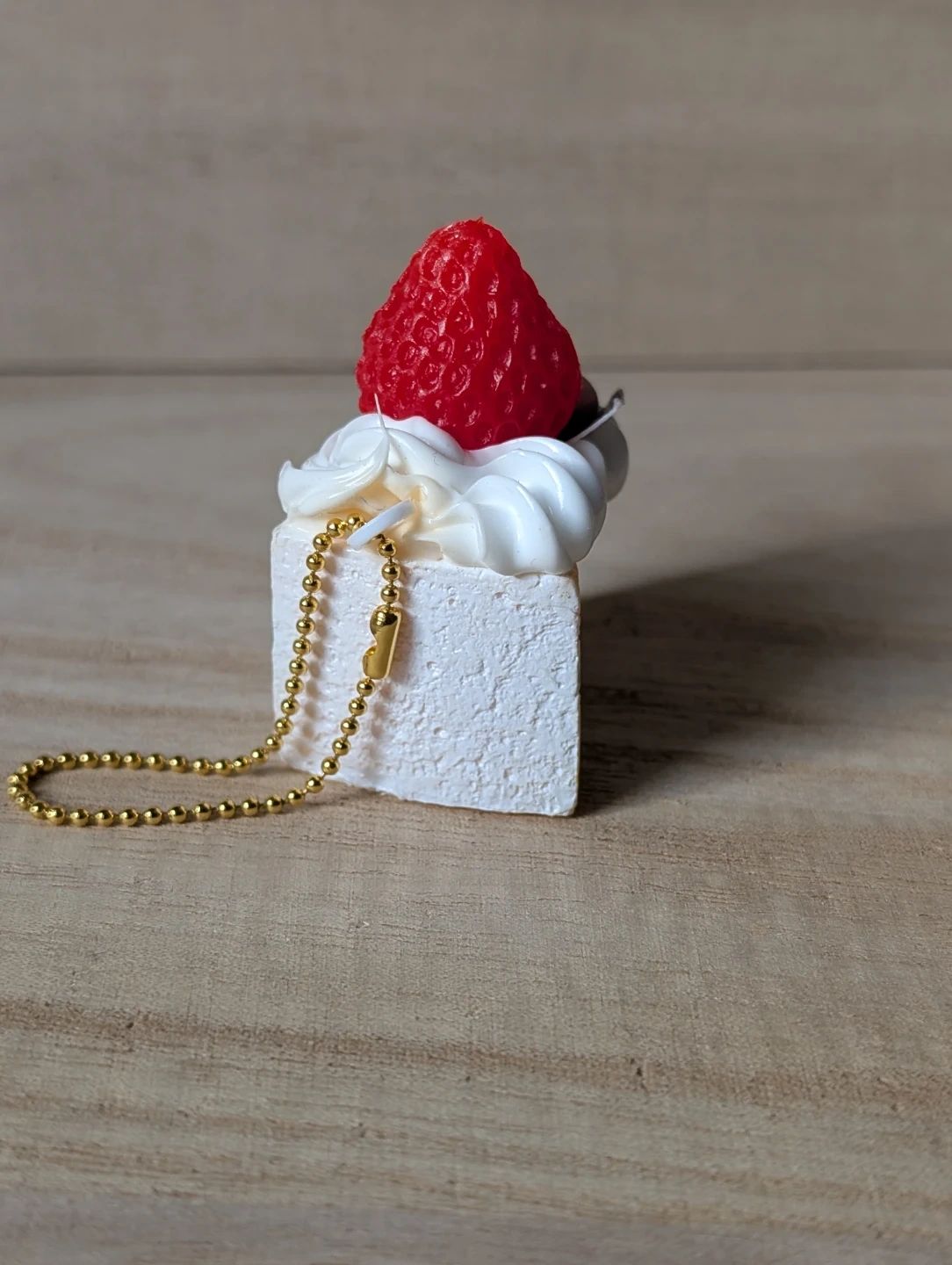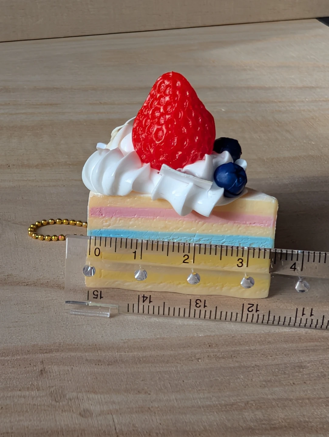 This is a cute rainbow cake slice charm. It features colourful layers, whipped cream, a strawberry, and two blueberries on top. It's about 2.5 inches tall and has a gold ball chain. Makes a sweet little accessory!