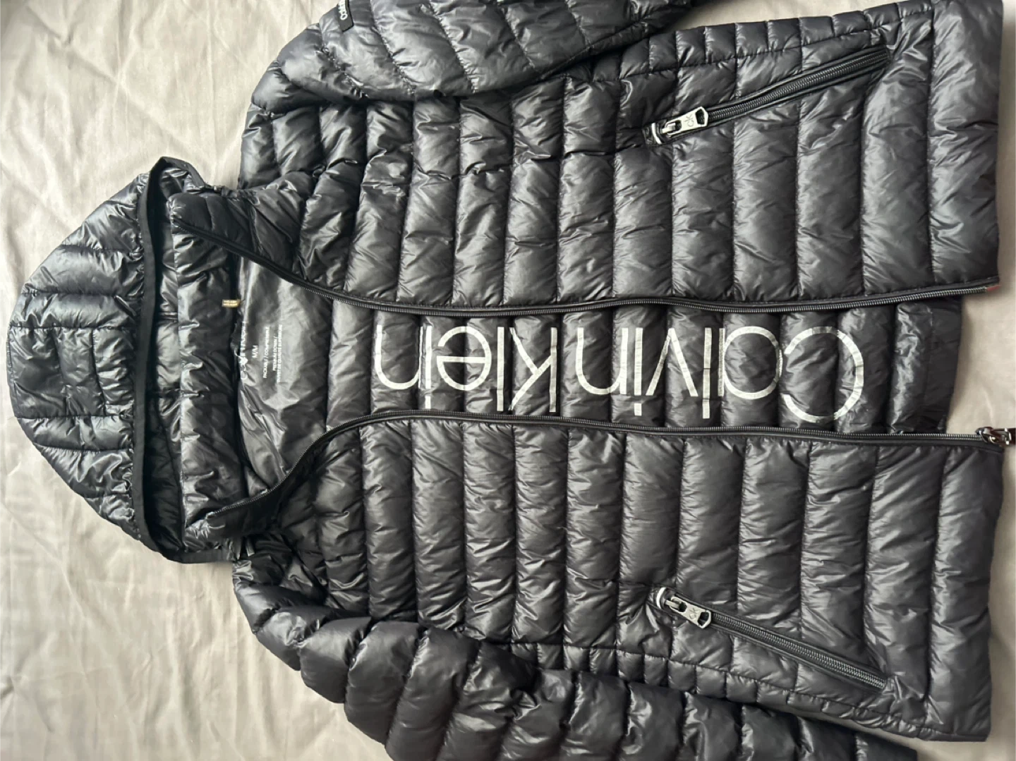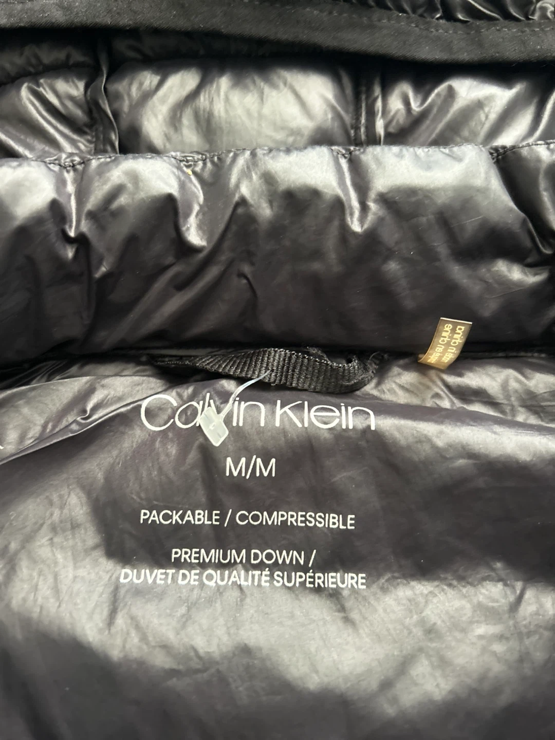 This is a Calvin Klein packable and compressible premium down puffer jacket. It is black and size M/M.