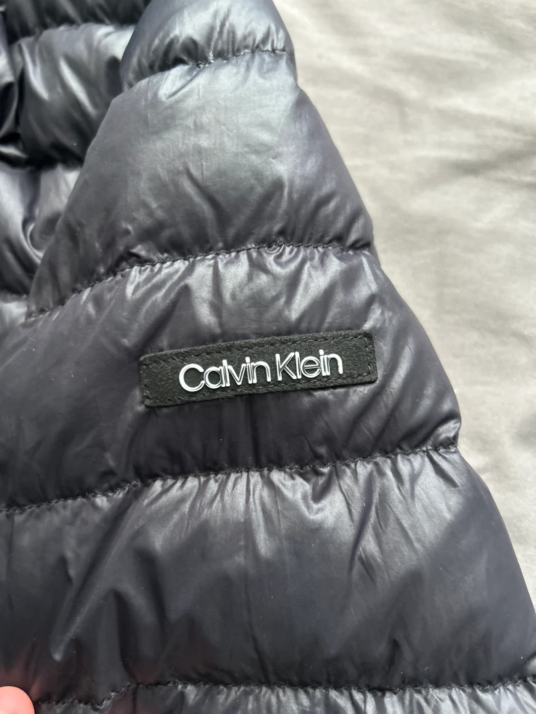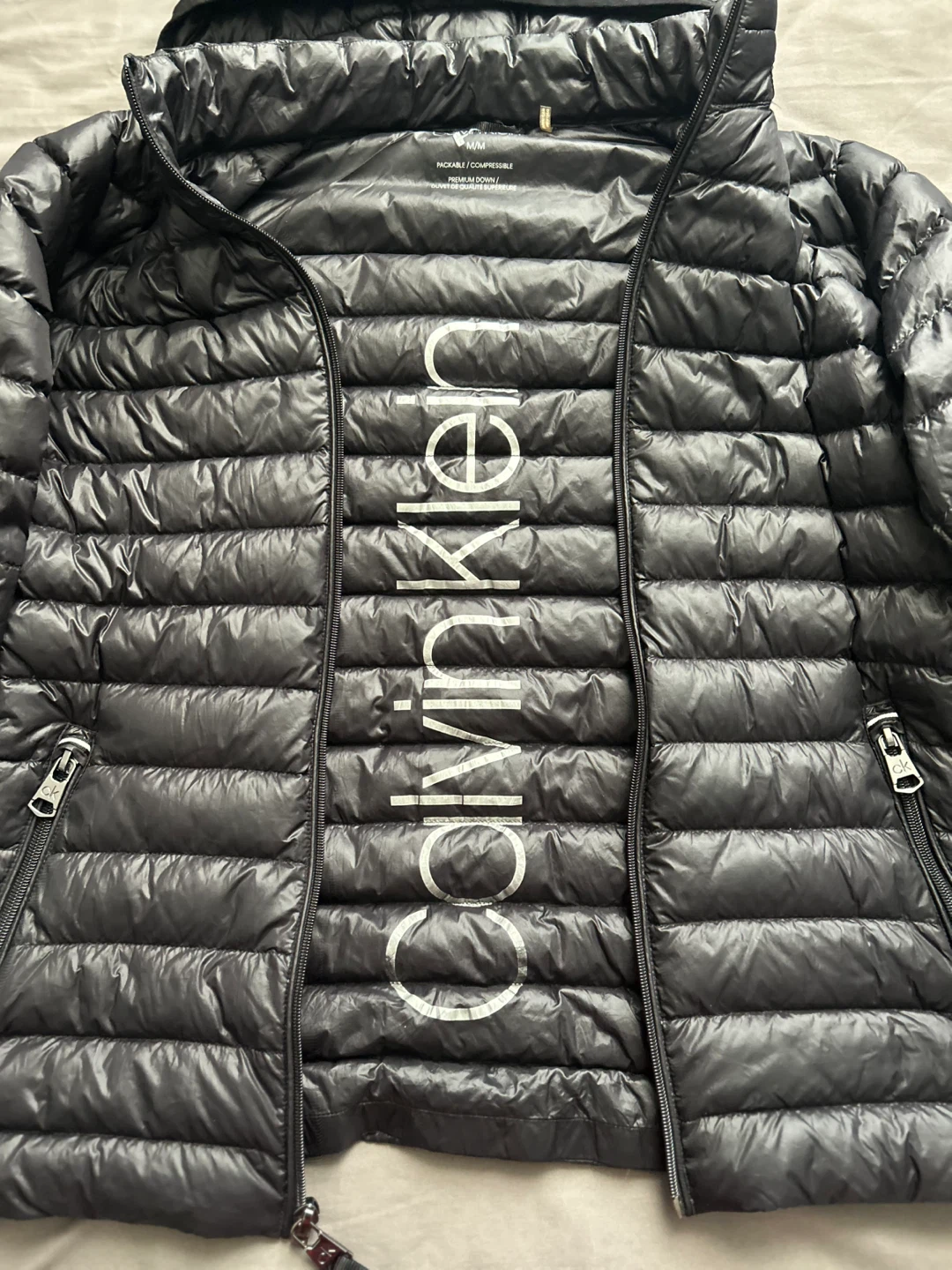This is a Calvin Klein packable and compressible premium down puffer jacket. It is black and size M/M.