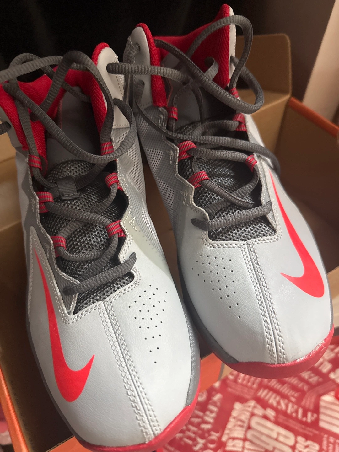 These Nike basketball shoes are white with red and grey accents. They're a youth size 6Y and come with the original box. Made in Indonesia.