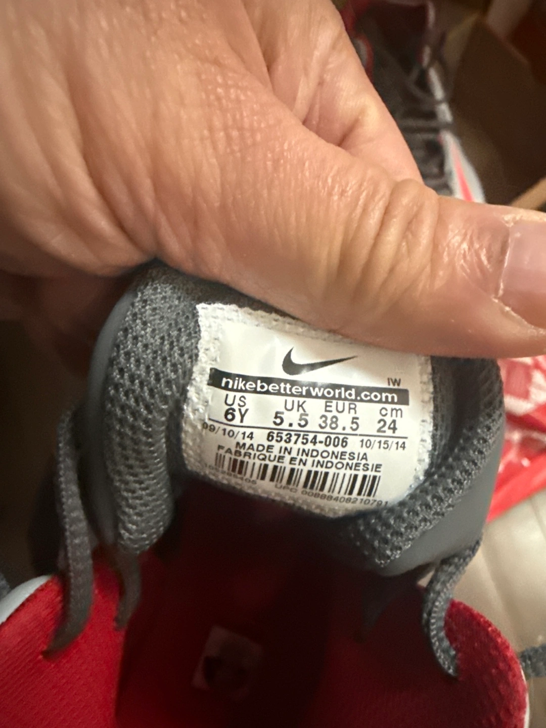 These Nike basketball shoes are white with red and grey accents. They're a youth size 6Y and come with the original box. Made in Indonesia.