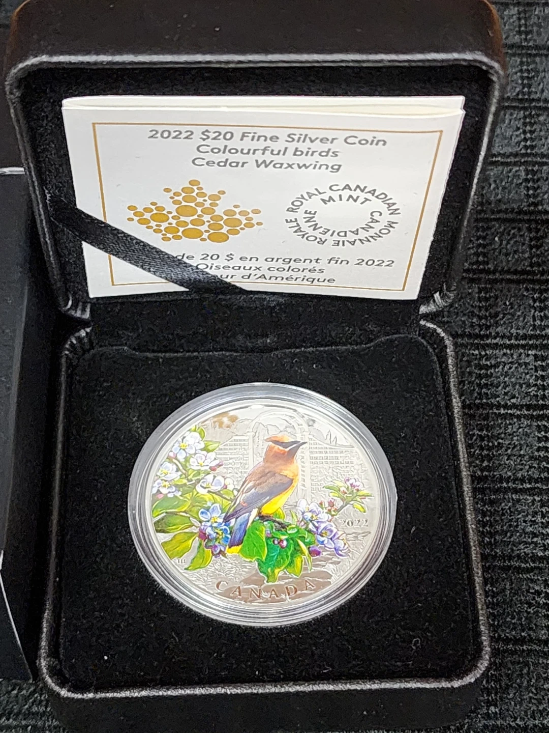 Selling a beautiful 2022 $20 fine silver coin featuring colourful birds, specifically the Cedar Waxwing. It comes in its original box and coa from the Royal Canadian Mint. A lovely addition to any collection!