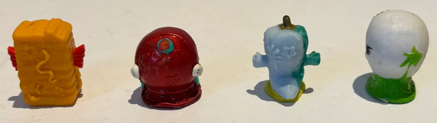 Set of four collectible figurines from The Grossery Gang. Figures include a skull, a character in sunglasses, a boxed character, and a red and white character. Great for adding to your collection!