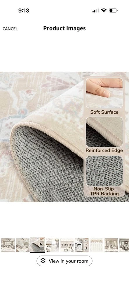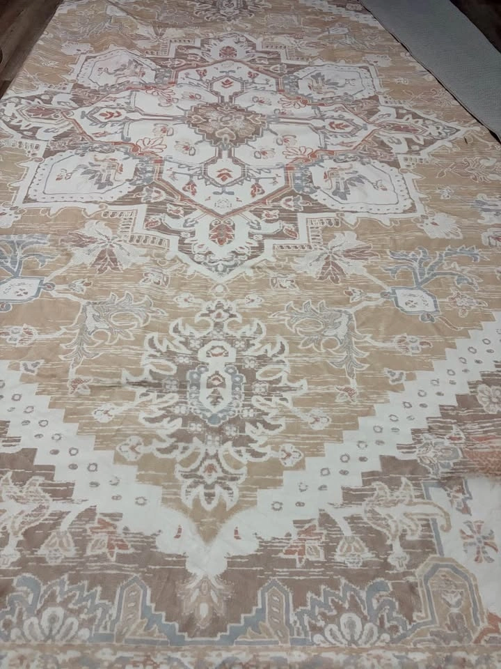 New, opened for photos. This 9x12 (270 cm x 360 cm) area rug is made of reinforced, skin-friendly Polyester, making it soft and comfortable. The material is also pet-friendly and can withstand pet scratching and high indoor traffic. It features a non-slip TPR backing for safety.