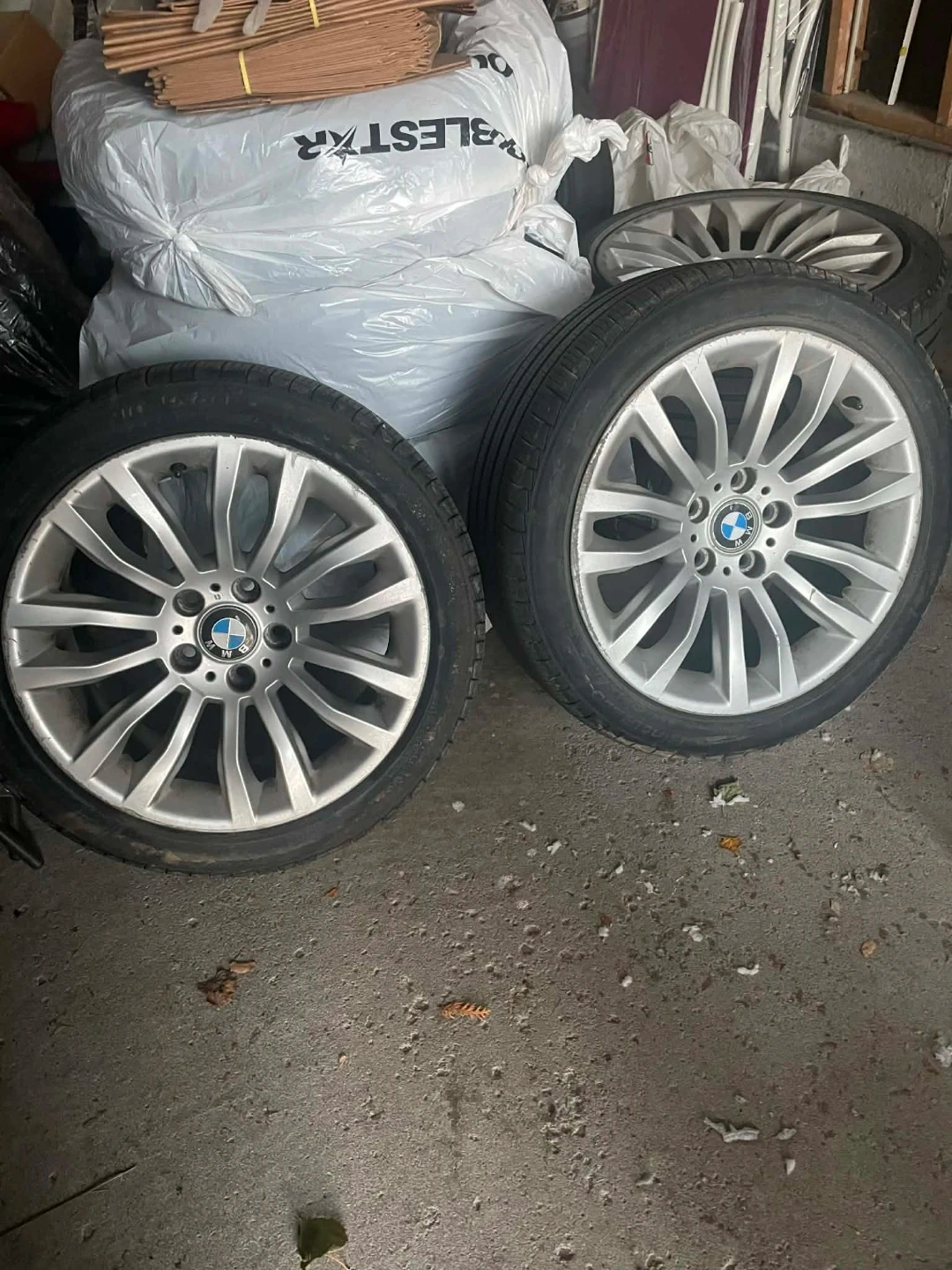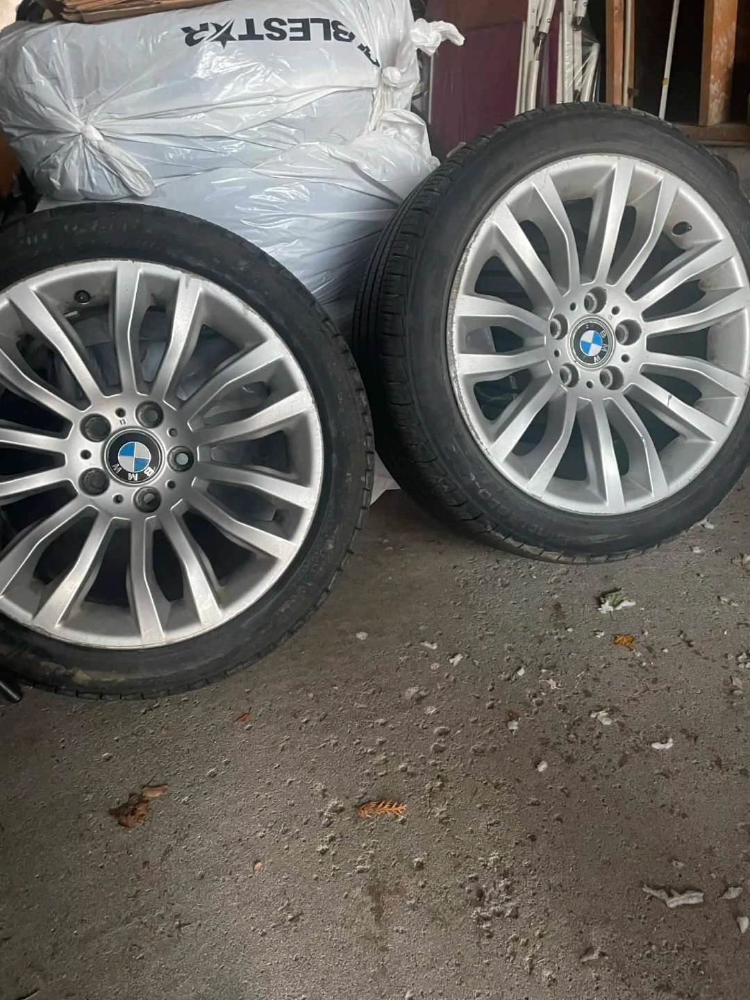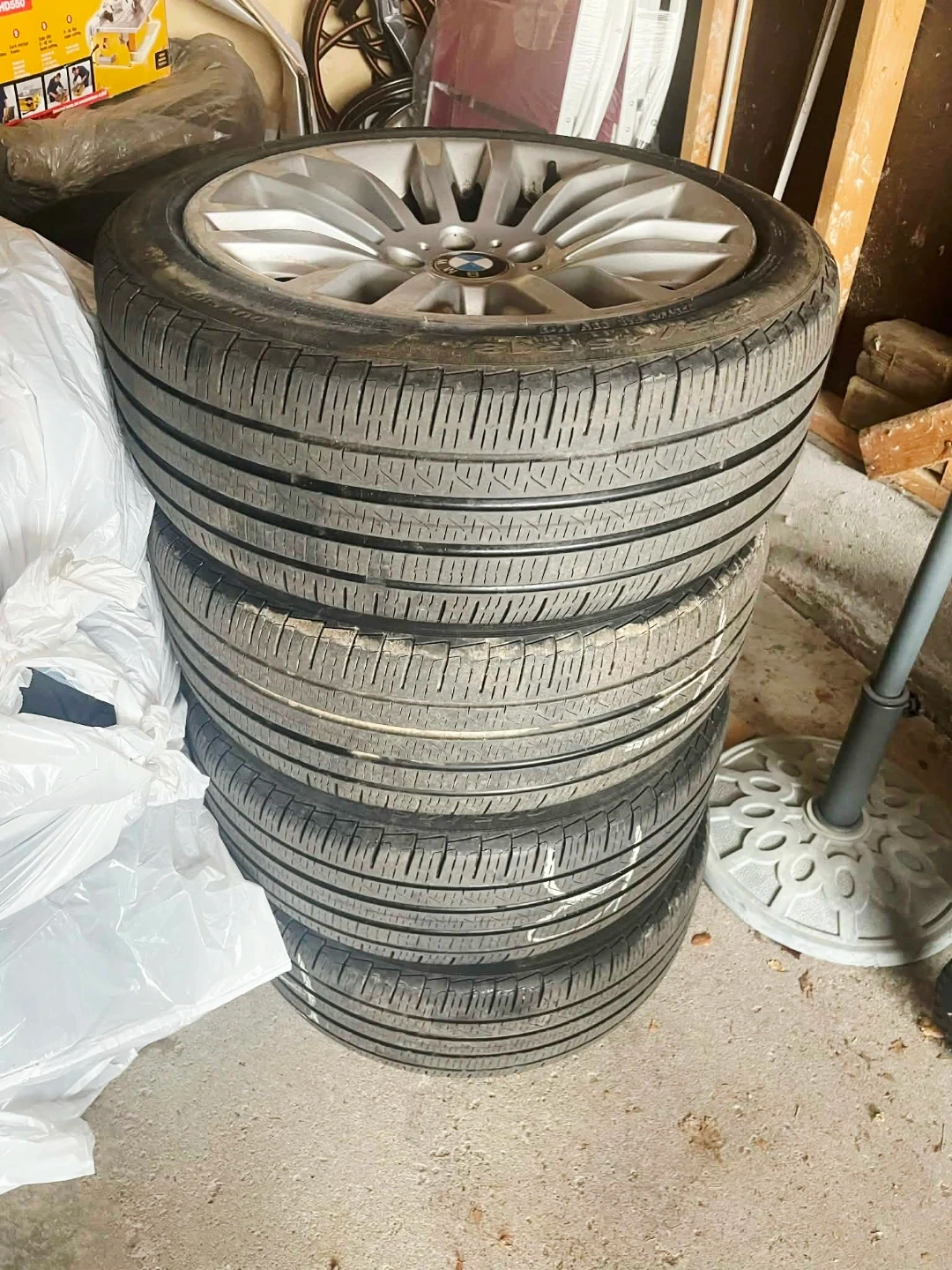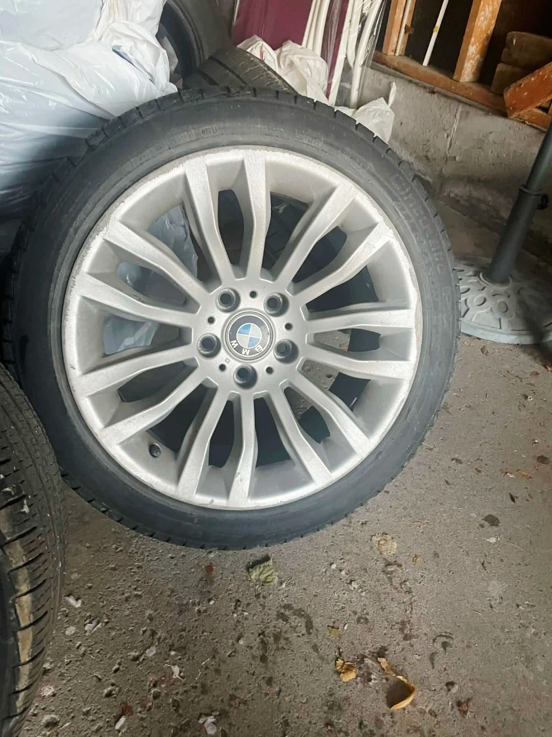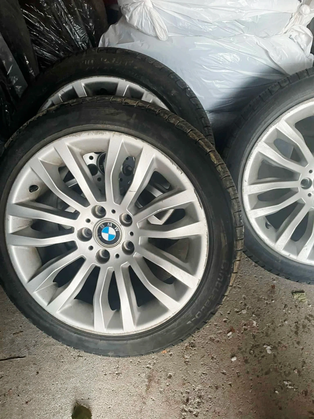 4 BMW alloy rims with a tires. These wheels are silver and has a multi-spoke design. It's suitable for BMW vehicles.