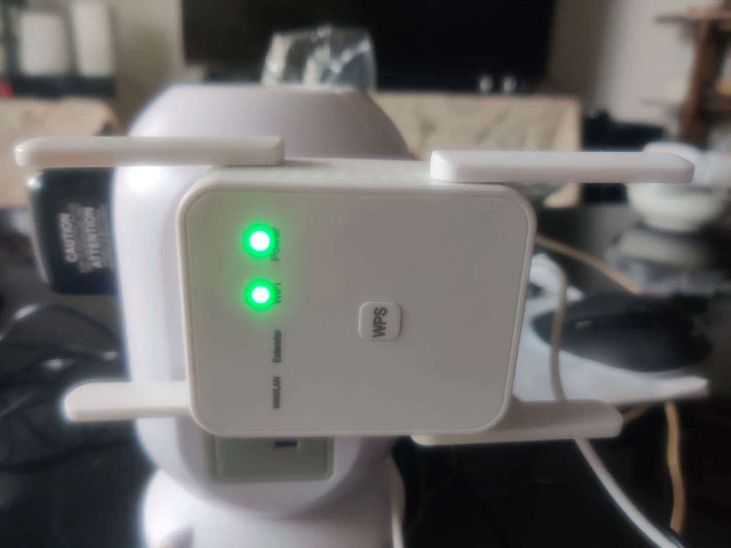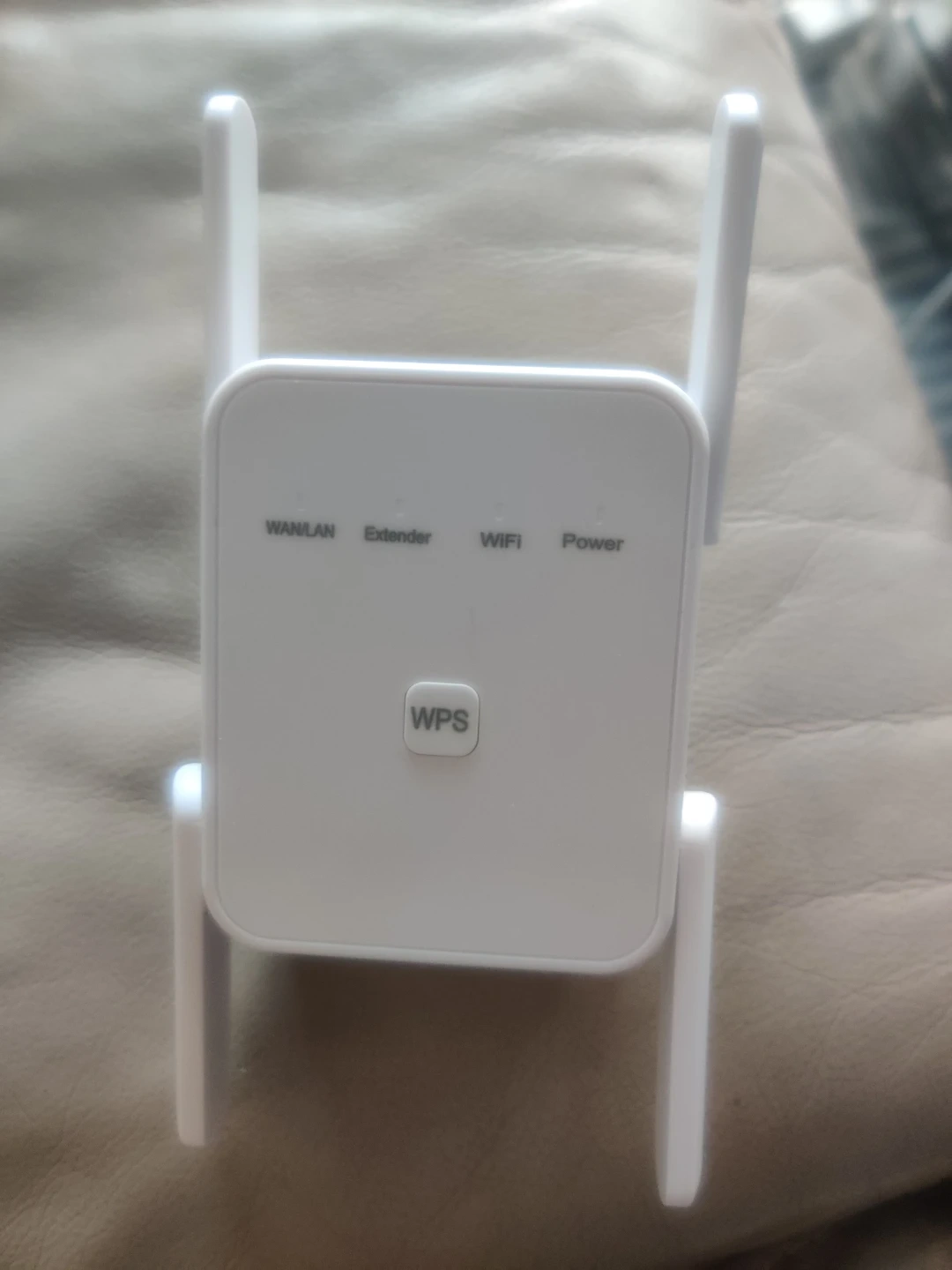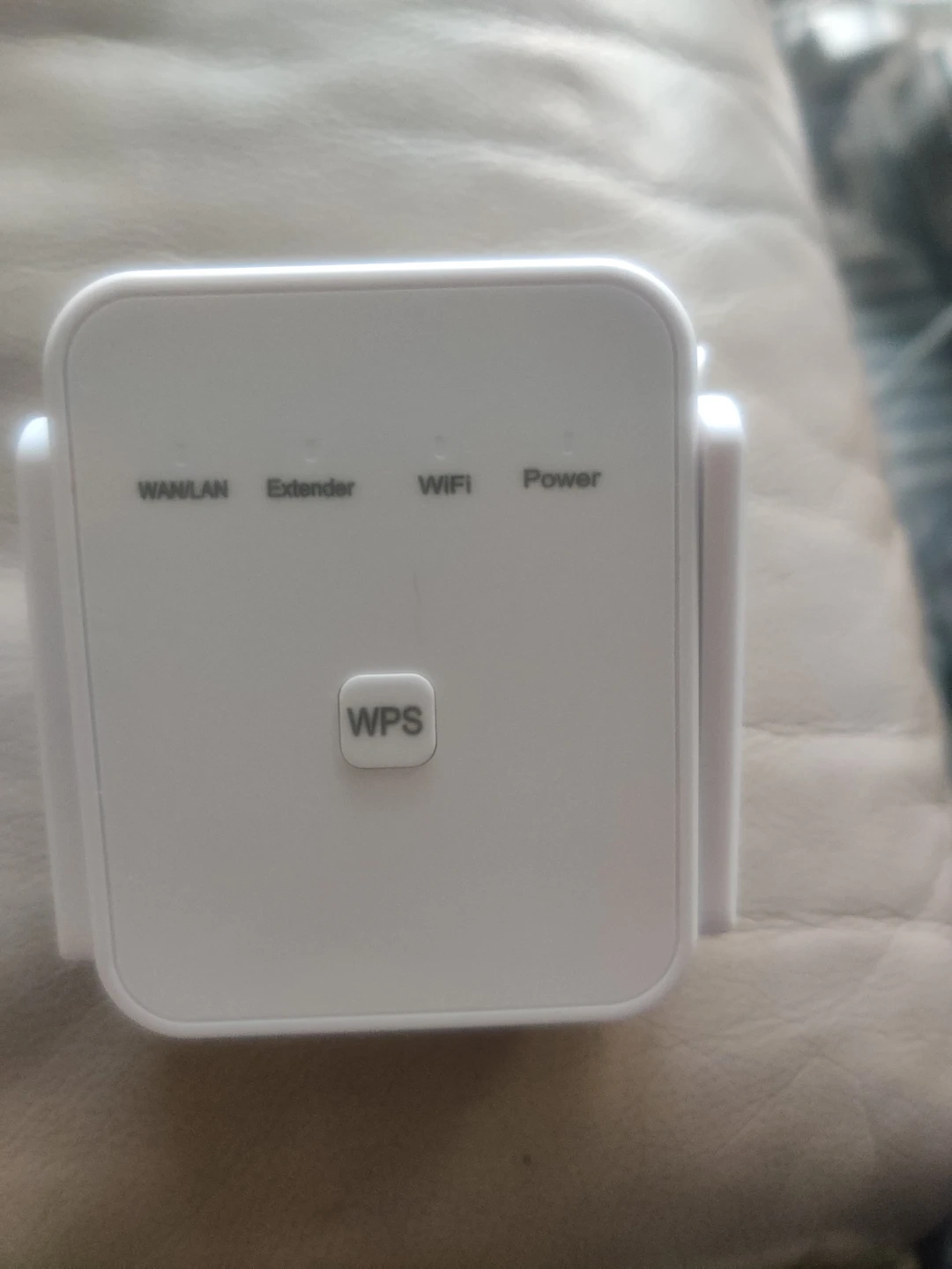 This is a white wireless Wi-Fi repeater and extender. It has a WPS button for easy setup. Works with 100-240V power input.