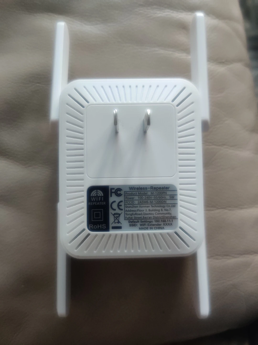 This is a white wireless Wi-Fi repeater and extender. It has a WPS button for easy setup. Works with 100-240V power input.