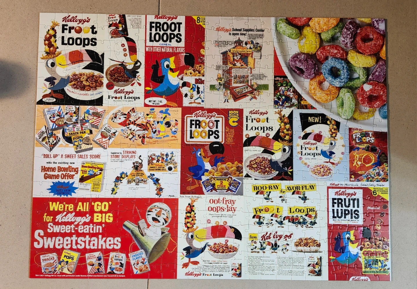 Kellogg's 4-in-1 puzzle set! Each puzzle features a different Kellogg's cereal: Corn Flakes, Cocoa Krispies, Rice Krispies, and Froot Loops. It's a fun challenge with 500 pieces per puzzle! Comes with a poster too