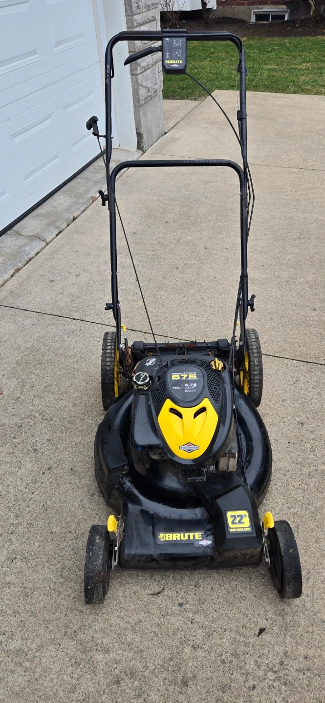 This Brute lawn mower features a 22-inch cutting deck and a 6.75 HP Briggs & Stratton engine. It's self-propelled for easier manoeuvring. Engine displacement is 163cc.