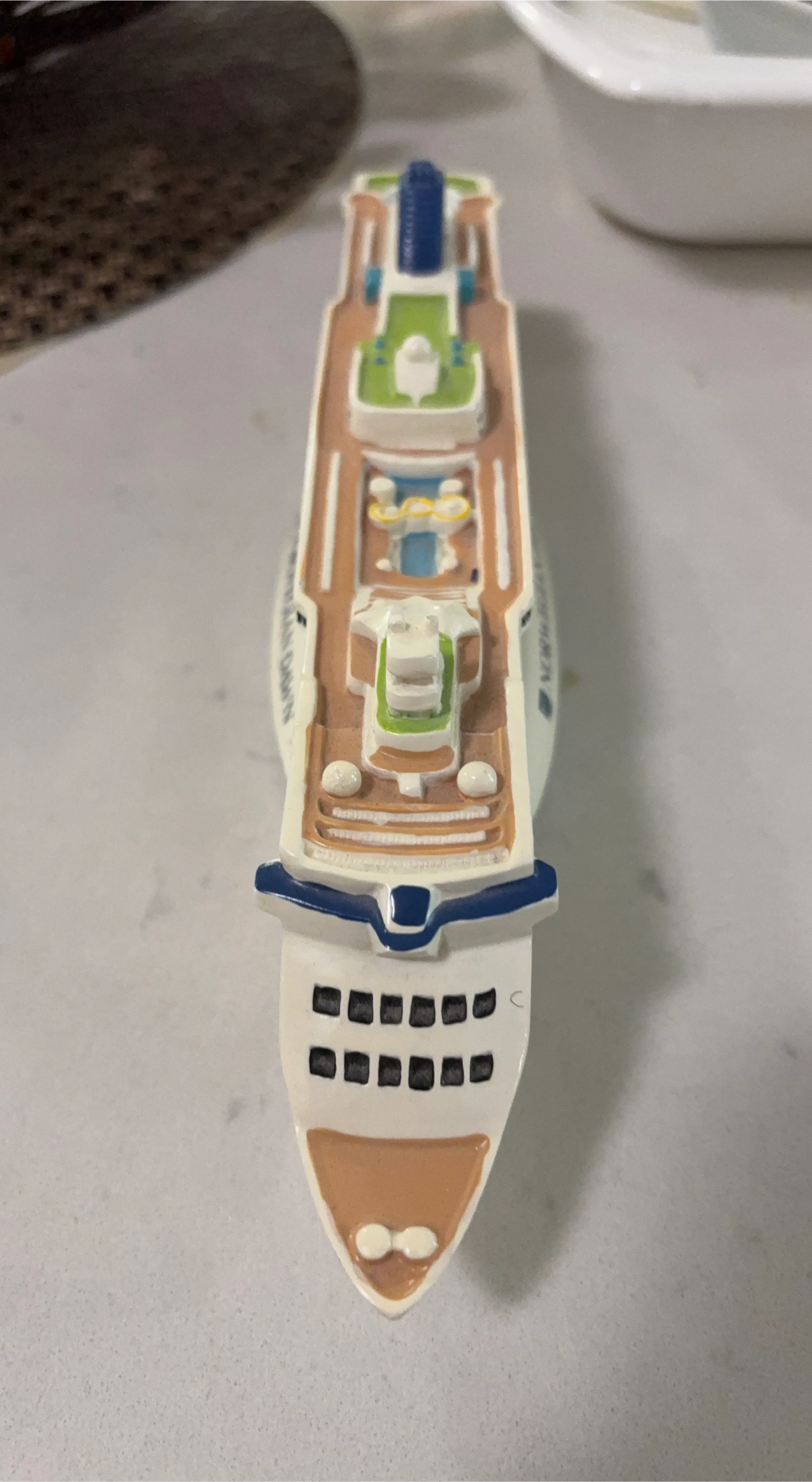 This is a detailed model of a cruise ship, featuring multiple decks and exterior details. It's made of plastic and is a great display piece. Perfect for collectors or anyone who loves maritime models!