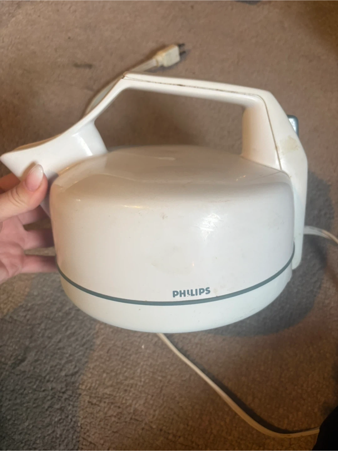 This is a white Philips electric kettle. It has a cord and handle for easy use. Plastic exterior. Just needs a little clean