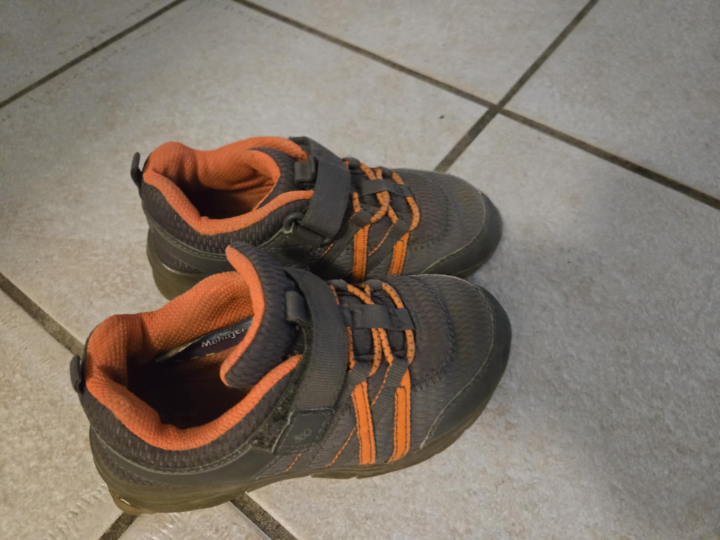 Selling a pair of Monagur kids' sneakers in a grey and orange colour scheme. These shoes feature a Velcro strap closure for easy on and off. They're in good condition and ready for a new home!