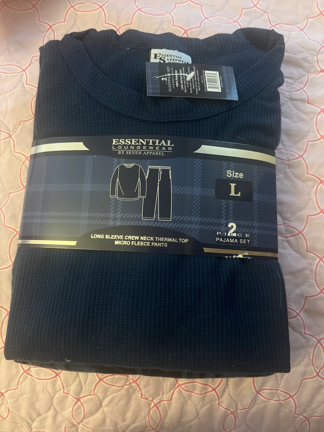 New, men's size large pajama set. Long sleeve thermal top and micro fleece pants. 100% polyester. Made in China.