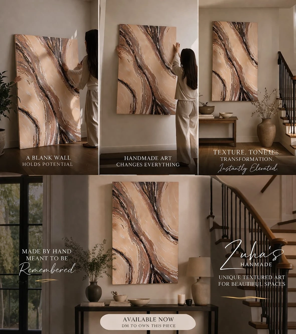 Bring warmth, elegance, and luxury into your space with this one-of-a-kind handmade textured artwork. Created using a palette knife technique, this piece has rich depth and movement that looks stunning from every angle.