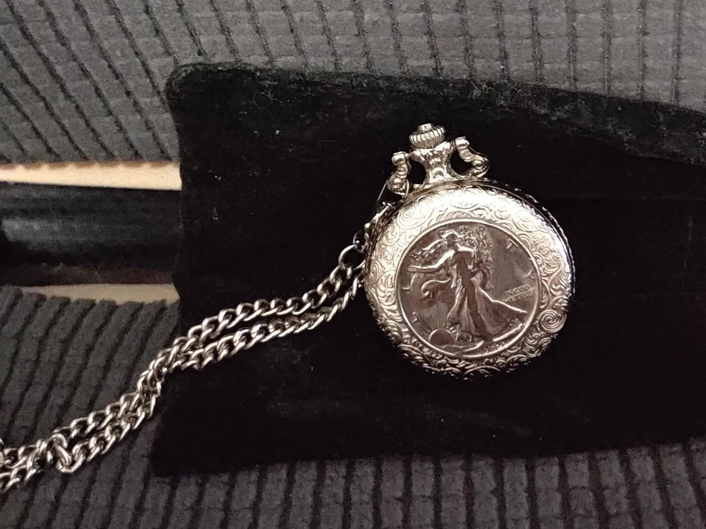 This pocket watch features a Walking Liberty silver coin design on its case. It comes with a matching chain. A classic accessory for any collection!