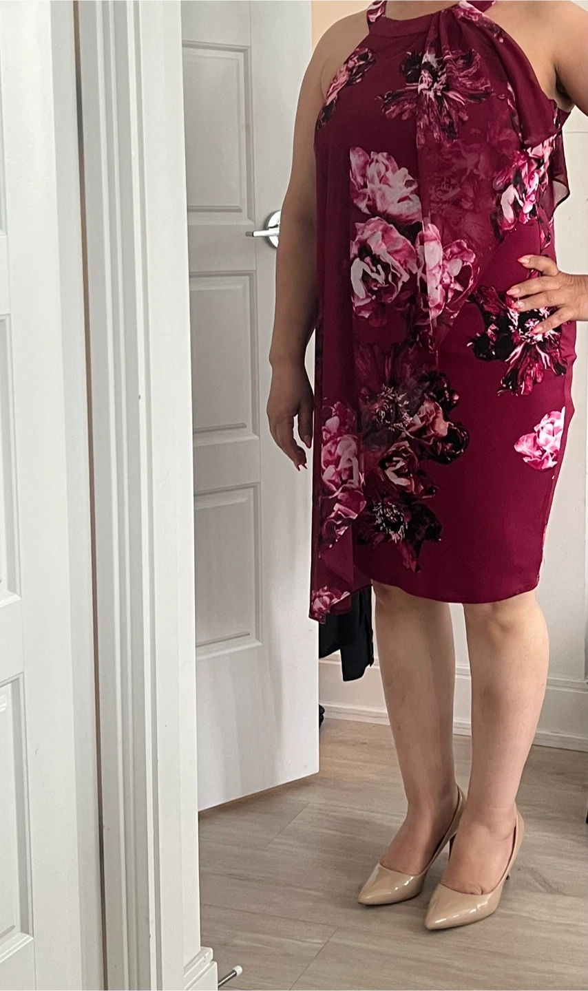 Selling a lovely burgundy dress with a floral pattern. It's a halter style and perfect for a special occasion or a night out. The dress is in great condition and ready for a new home!