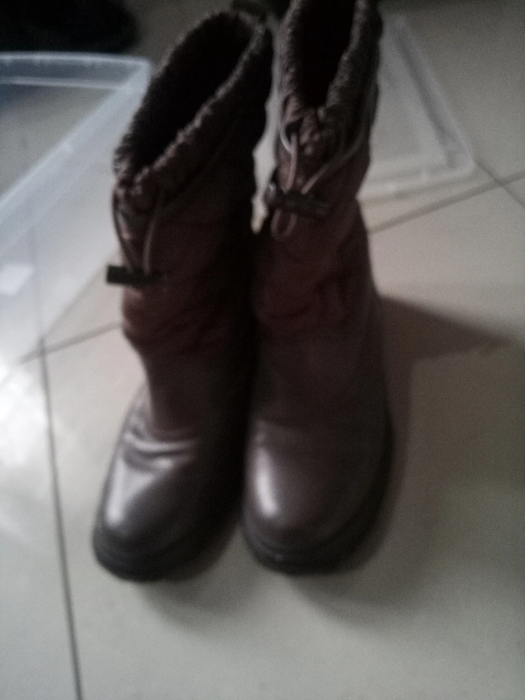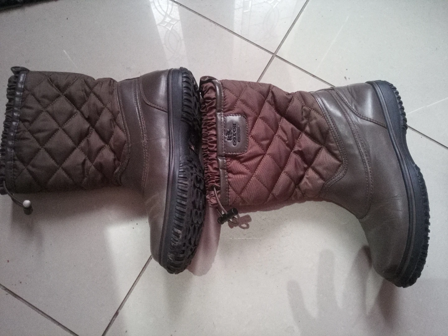 These brown quilted winter boots are from Coach. They're made with a combination of leather and quilted fabric. The boots have a drawstring at the top for a snug fit. Perfect for keeping your feet warm on chilly days!