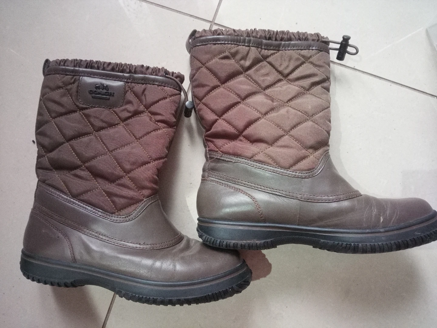 These brown quilted winter boots are from Coach. They're made with a combination of leather and quilted fabric. The boots have a drawstring at the top for a snug fit. Perfect for keeping your feet warm on chilly days!