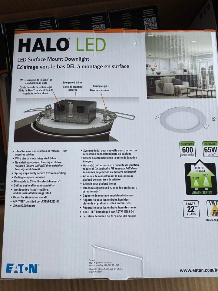 New 6 inch LED surface mount downlight. Bought extra, have several. Dimmable light with 3000K color. Has 600 lumens, replaces 65W bulbs. Wet location rated, so good for bathrooms or outdoors. No housing or J-box needed, direct ceiling mount. Can meet in the city if need be. $10 each or box of six for $50. Have 40 available. Buy 2 boxes of 6 for $45 per box. Buy 3 boxes of six for $40 per box.