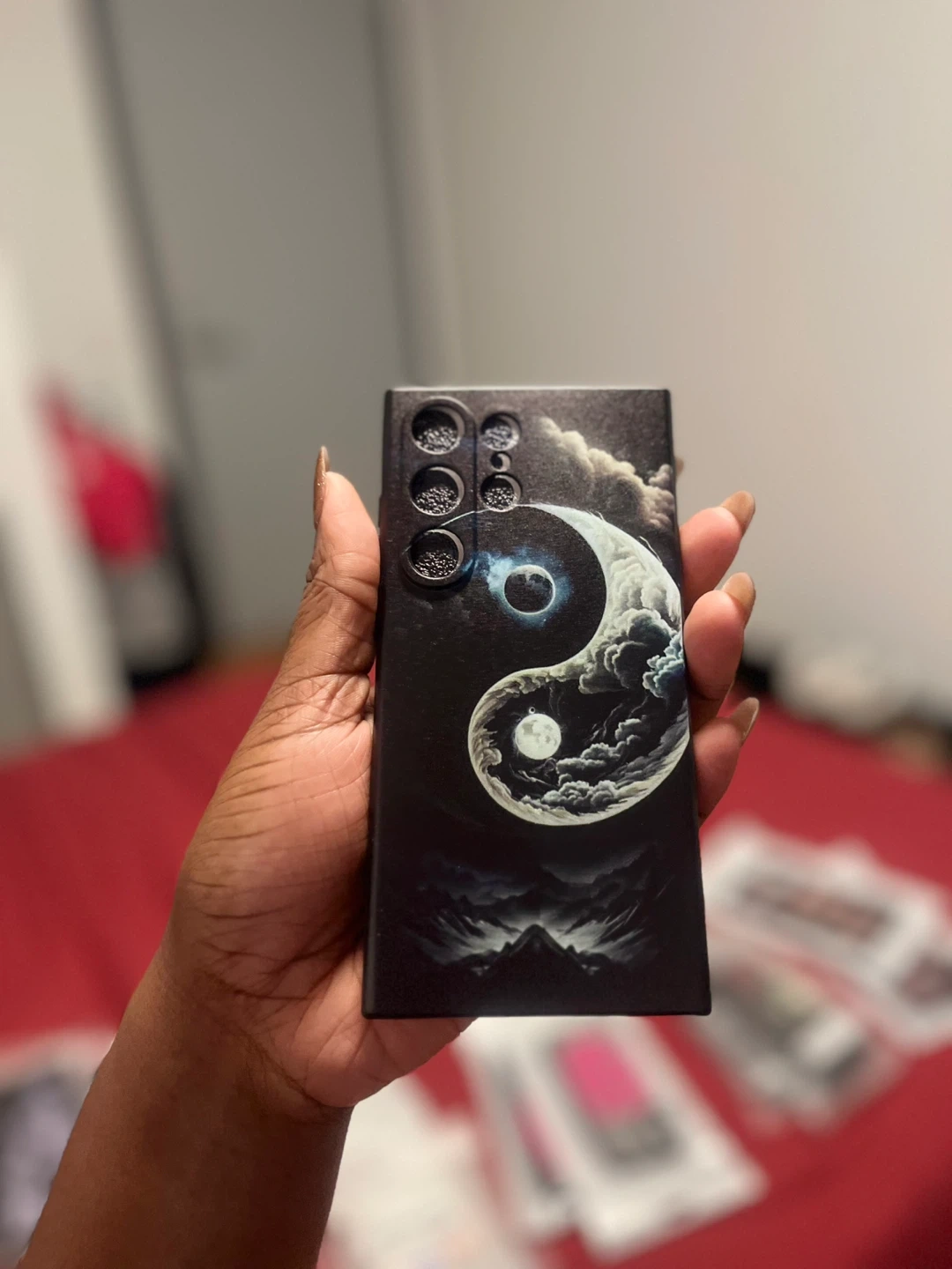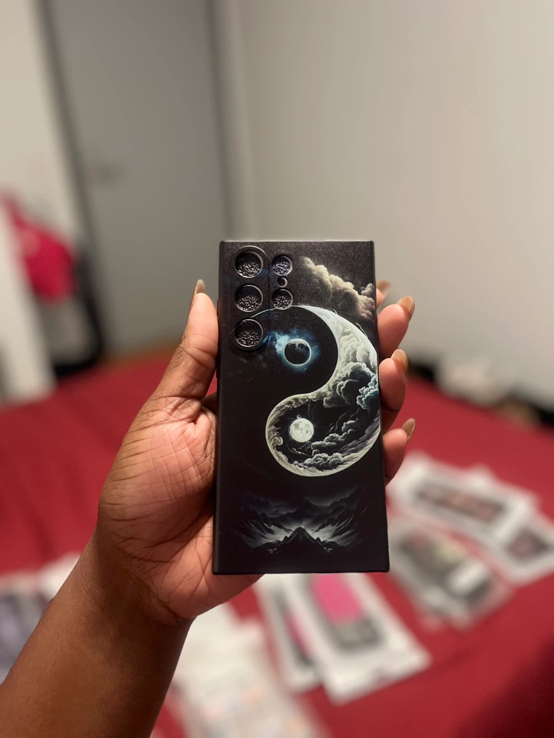 This phone case features a striking black and white yin yang design with celestial and mountain imagery. It appears to be designed for a Samsung Galaxy S24 smartphone Ultra. Protect your phone with this stylish case!