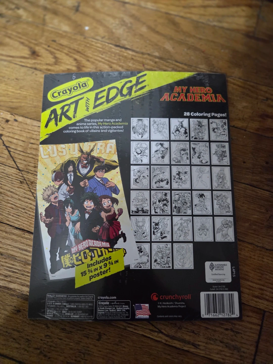 This Crayola Art With Edge coloring book features characters from the My Hero Academia manga and anime series. It includes 28 coloring pages and a full-color poster. The book measures 15 3/4 x 9 3/4 inches.
