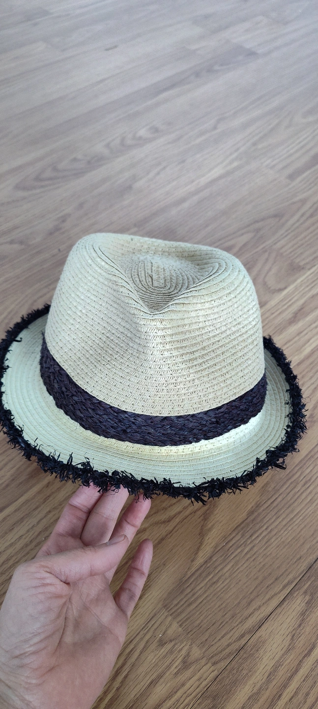 Stylish straw fedora. Features a dark brown band and black frayed trim. Perfect for summer.