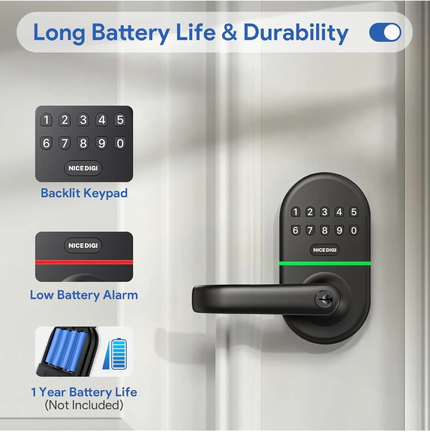 This NICE DIGI smart keypad door lock offers keyless entry for your front door. It supports up to 20 user codes and a one-time pin code, with no app required. Two physical keys are included as a backup. Installation is easy, taking about 5 minutes with just a screwdriver.