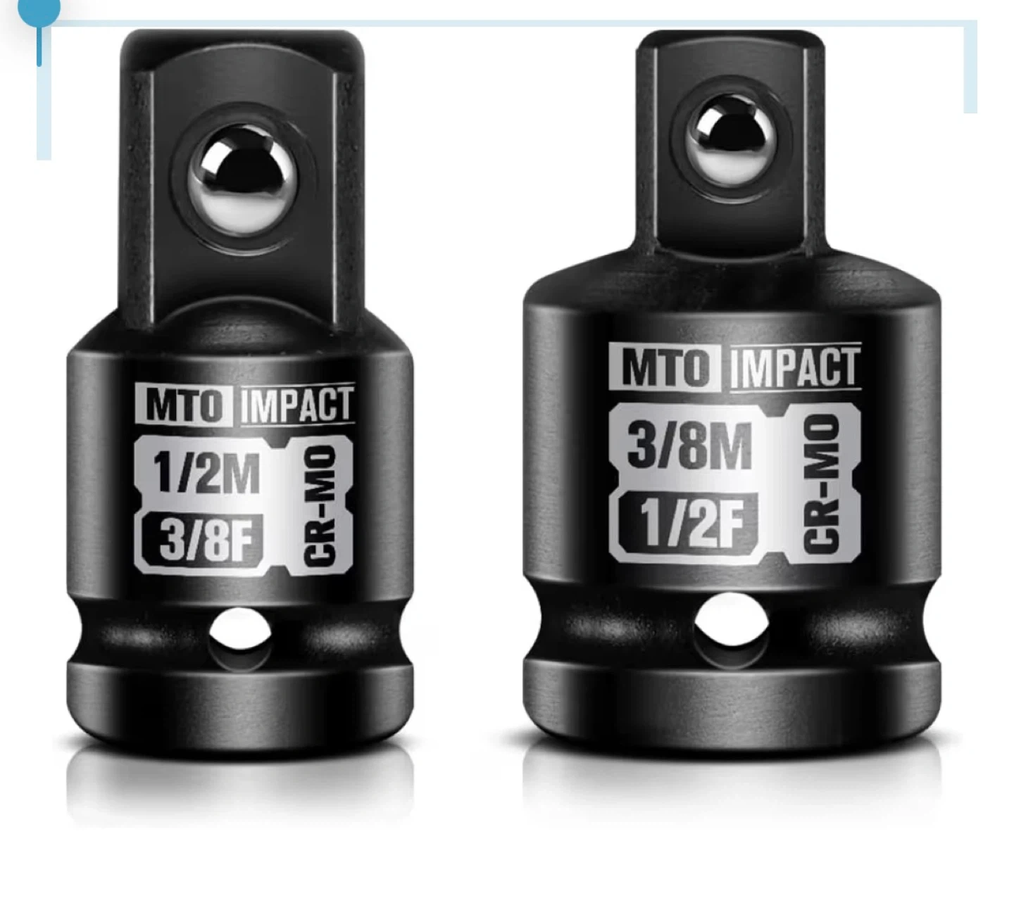 This set includes two MTO Impact socket adapters. One adapter is 1/2" male to 3/8" female, and the other is 3/8" male to 1/2" female. Made from CR-MO steel for durability. These adapters allow you to use different sized sockets with your existing tools.