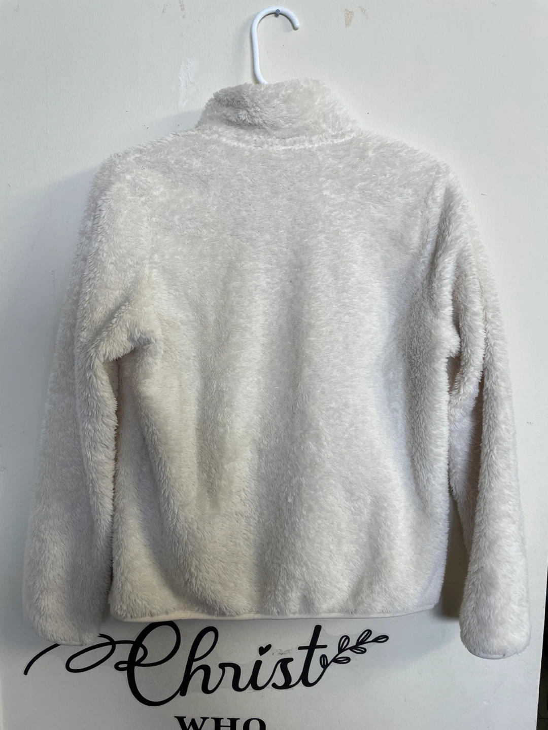 Cozy white Uniqlo fleece jacket with a full zip closure. Soft fluffy material for warmth. Great for layering during cooler weather!