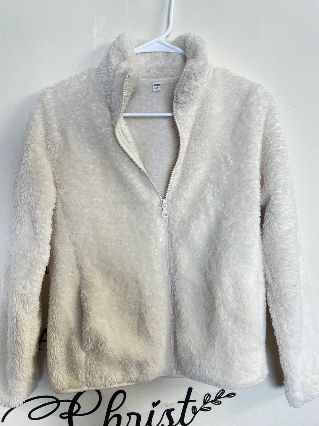 Cozy white Uniqlo fleece jacket with a full zip closure. Soft fluffy material for warmth. Great for layering during cooler weather!