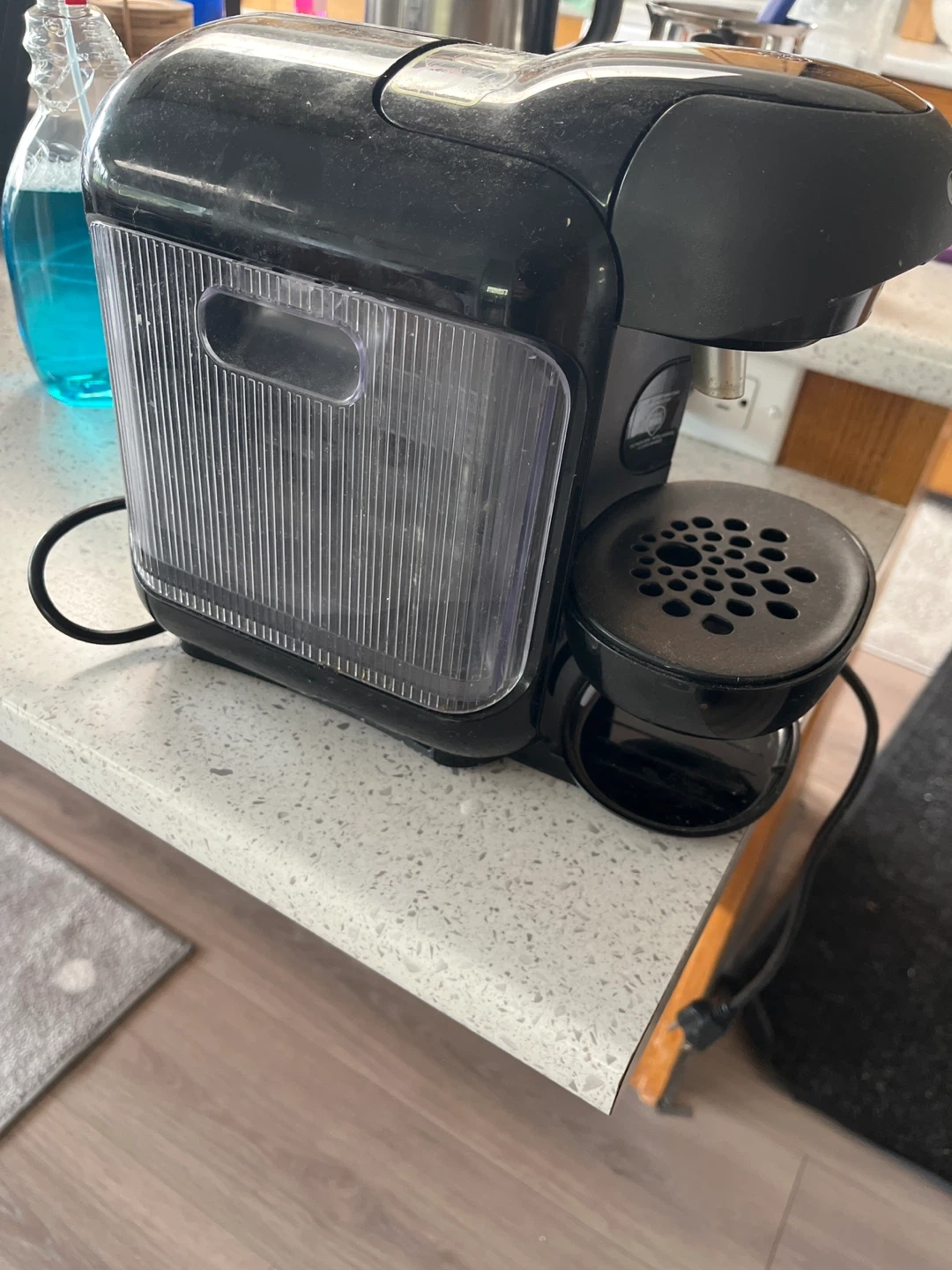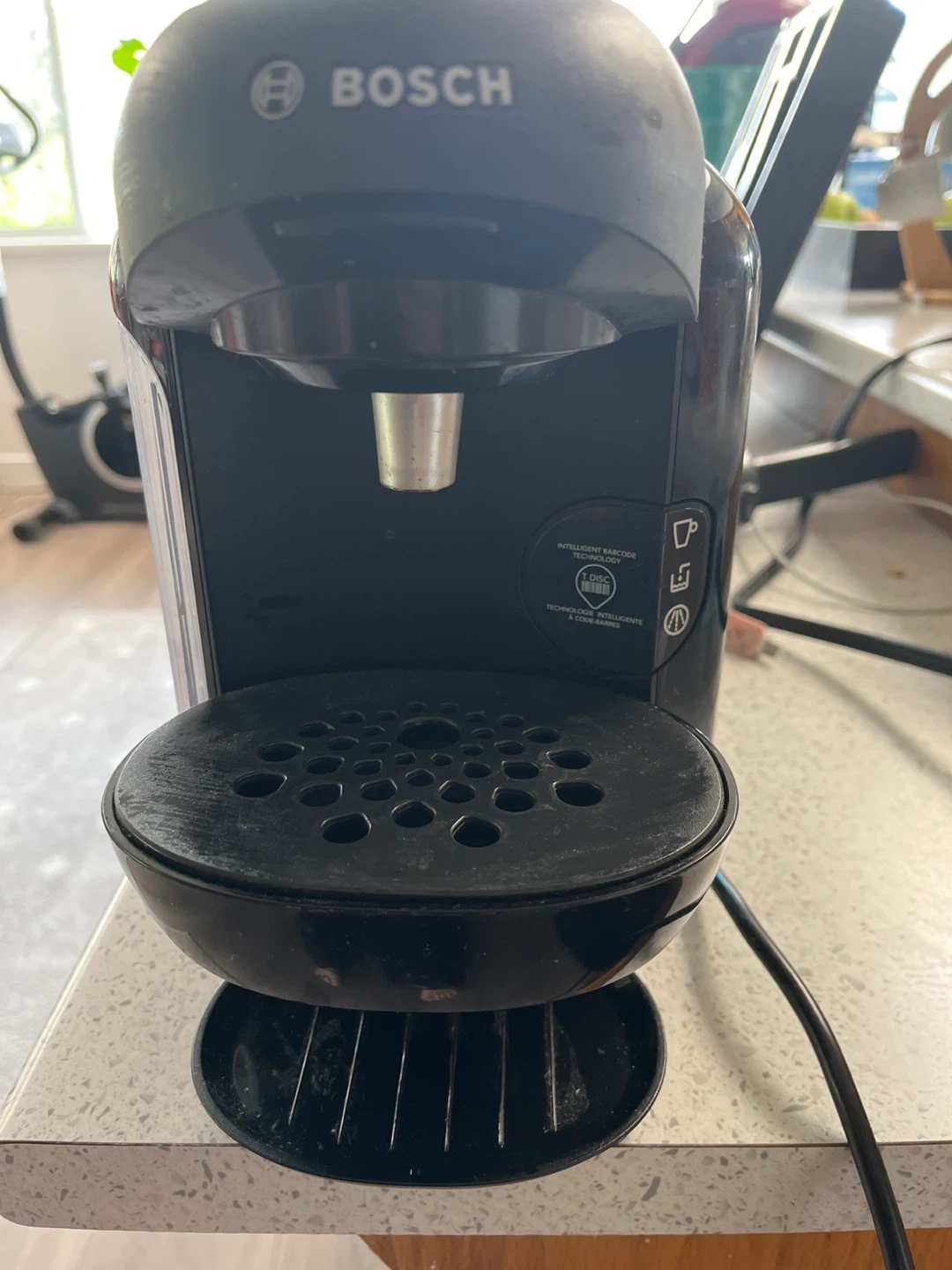 This is a black Bosch Tassimo coffee machine. It uses T-discs for brewing. Works well and is ready for a new kitchen!