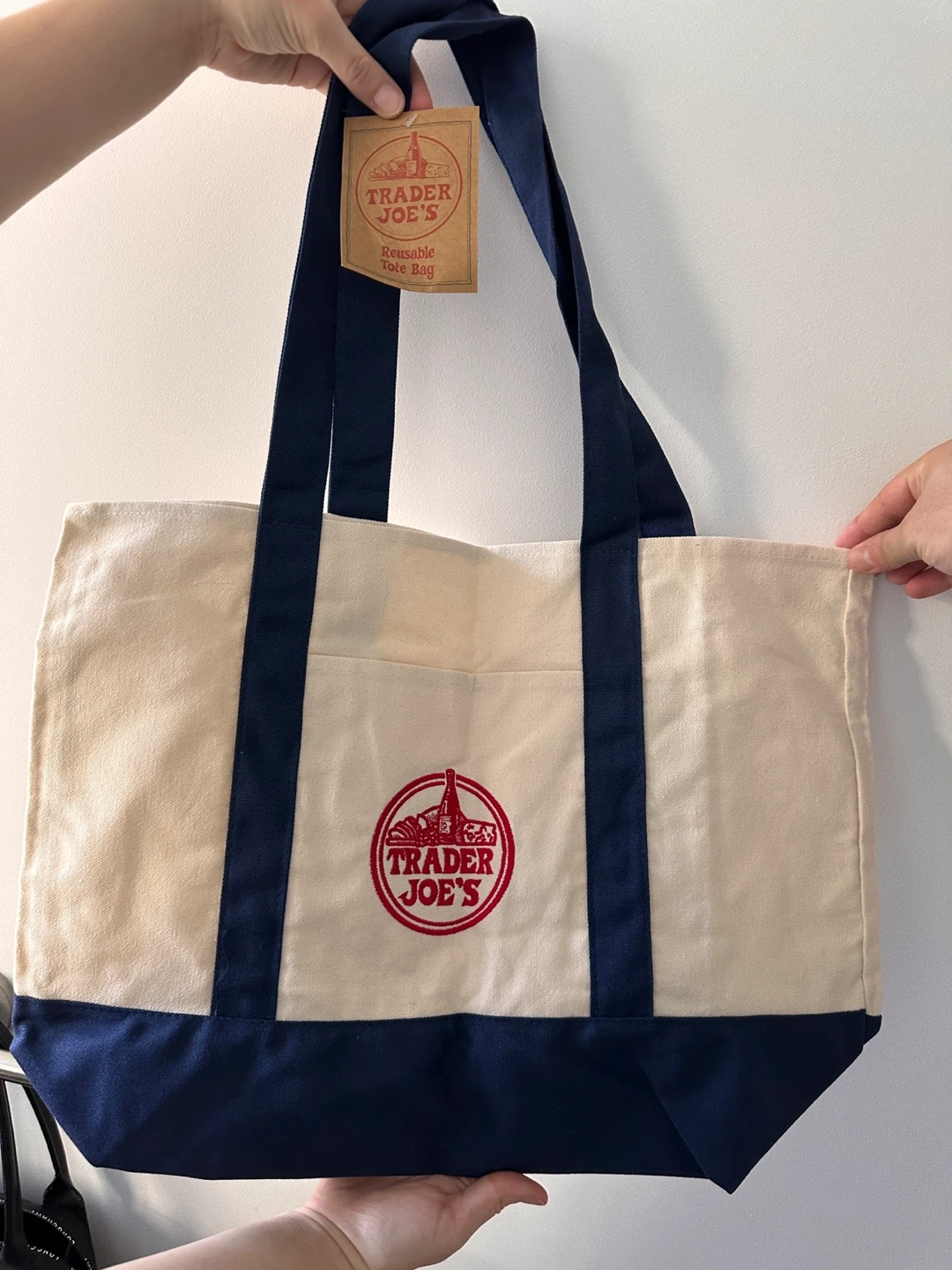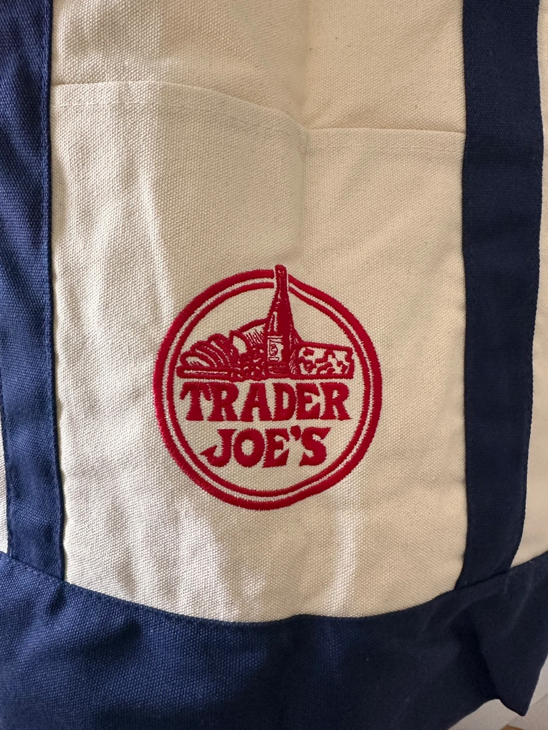This is a reusable tote bag from Trader Joe's. It features navy blue handles and a navy blue base. The bag is made of canvas and has the iconic Trader Joe's logo embroidered on the front. It's handy for groceries or everyday use!