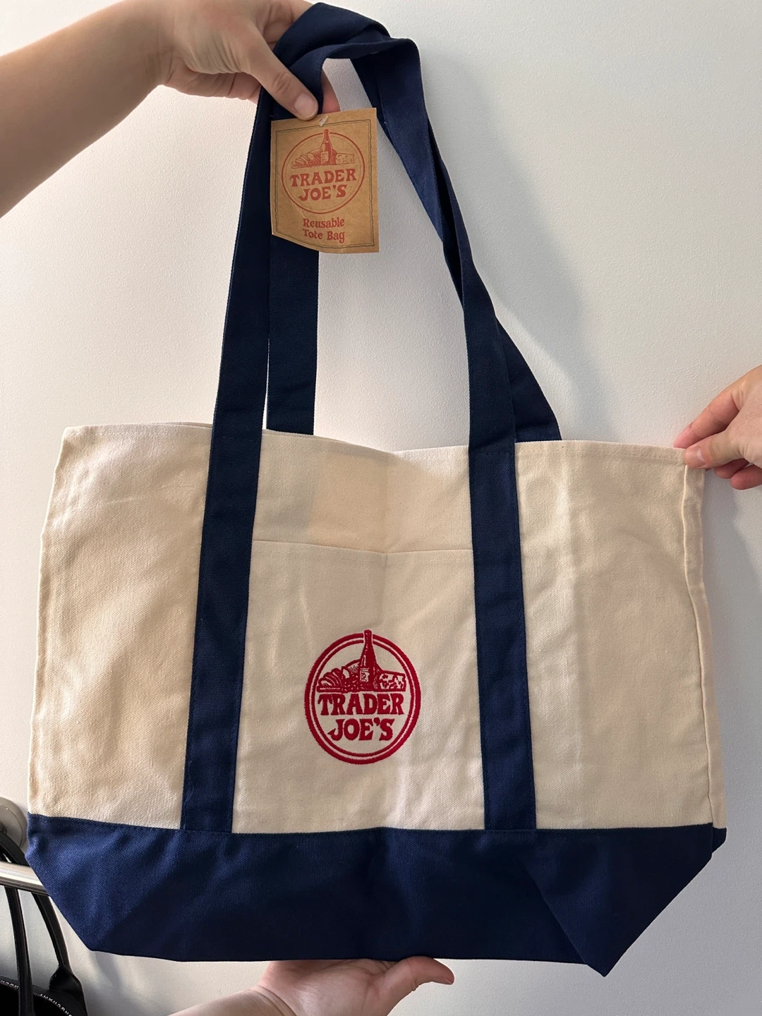 This is a reusable tote bag from Trader Joe's. It features navy blue handles and a navy blue base. The bag is made of canvas and has the iconic Trader Joe's logo embroidered on the front. It's handy for groceries or everyday use!