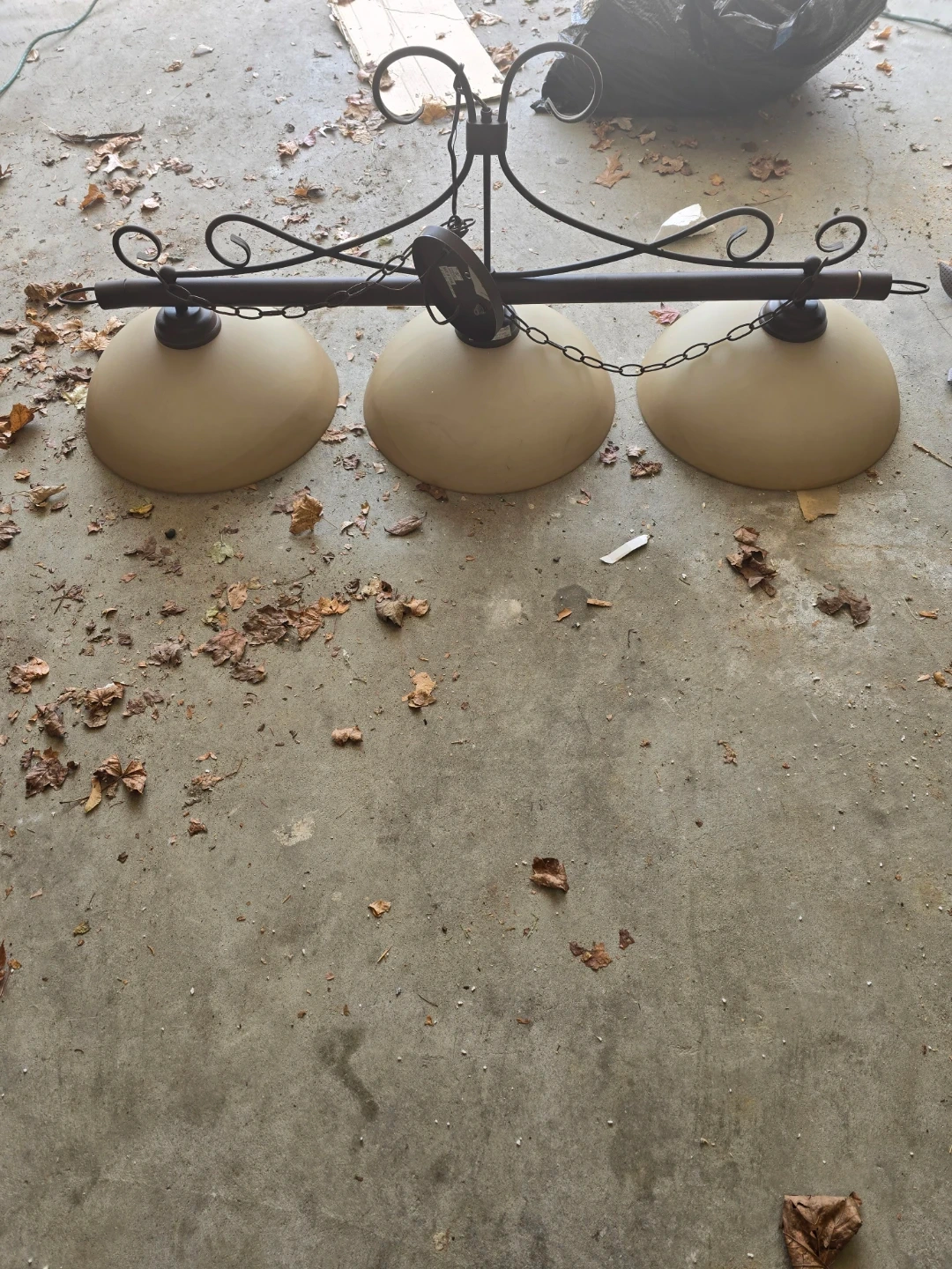 Three-light chandelier with bell-shaped shades. It's designed for pool tables. The fixture has a dark metal finish with decorative scrollwork. It includes chains for hanging.