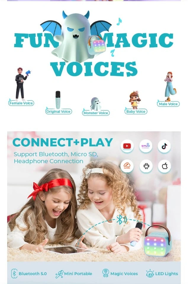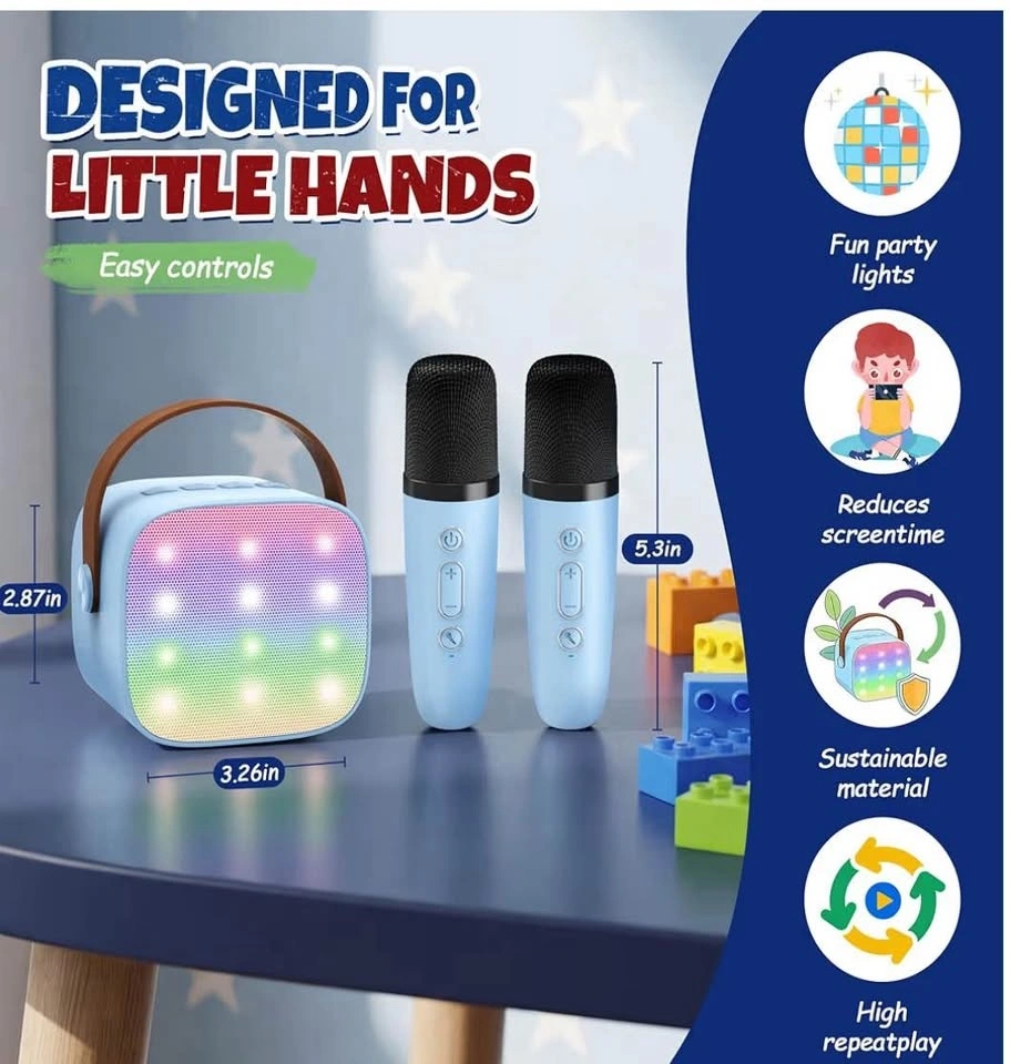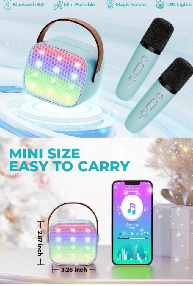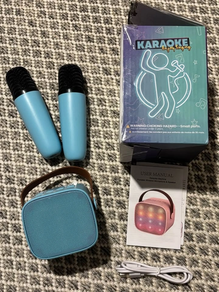 Brand new mini karaoke machine. Bluetooth speaker with 2 wireless microphones, in blue. This multi-function karaoke machine comes with 4 kinds of magic voices. The LED lights beat with the rhythm of the music.