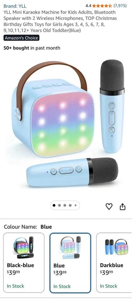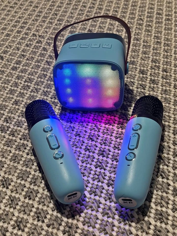 Brand new mini karaoke machine. Bluetooth speaker with 2 wireless microphones, in blue. This multi-function karaoke machine comes with 4 kinds of magic voices. The LED lights beat with the rhythm of the music.