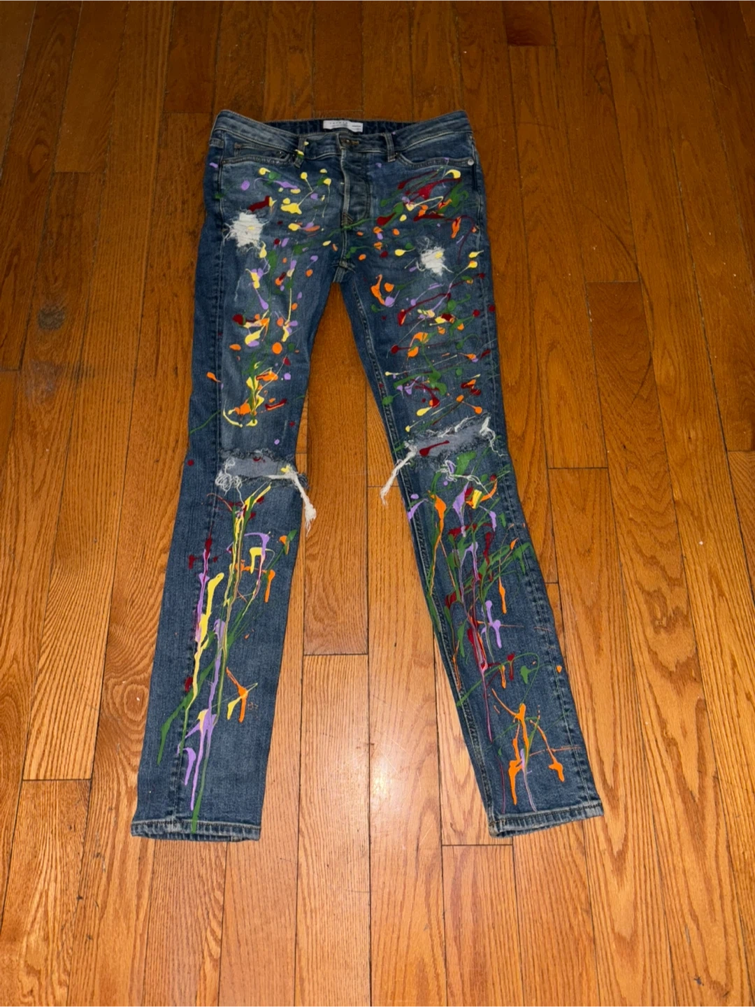 Selling a pair of distressed jeans with a unique painted design. These jeans are perfect for adding a pop of colour to your wardrobe!