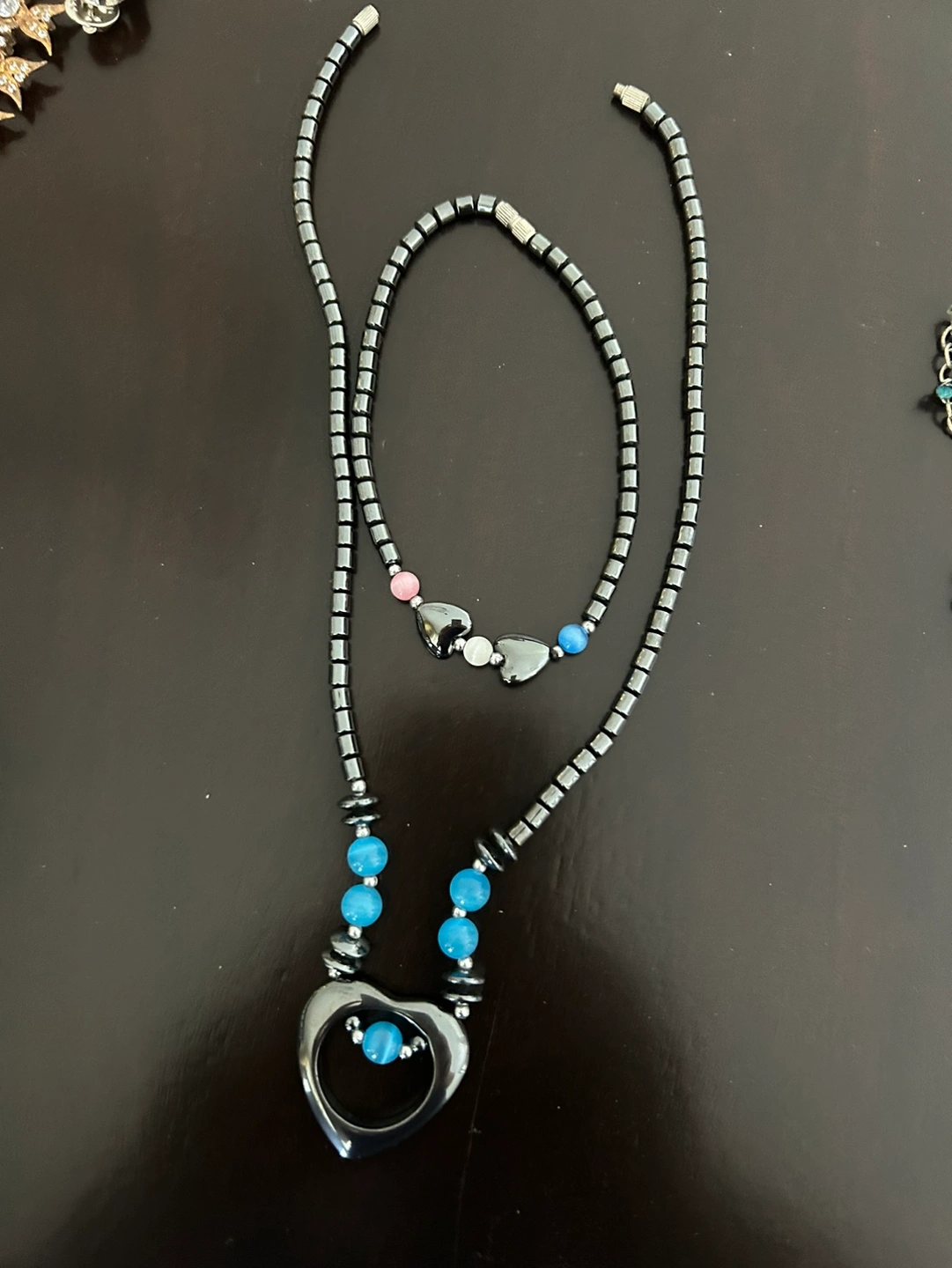 This set includes a long necklace with a heart pendant and bracelet Both necklaces are made of hematite beads. The long necklace has blue beads and the shorter one has pink, blue and clear beads.