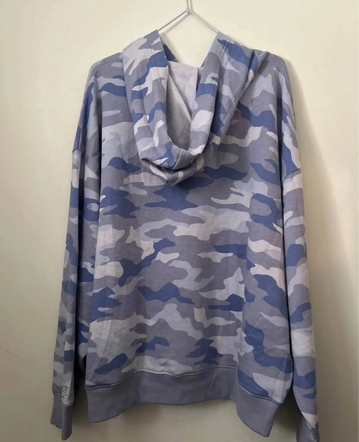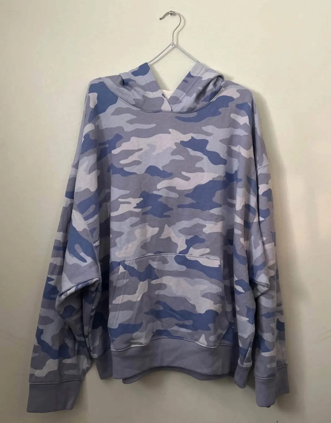 Camo print hoodie, light blue and grey colours. Long sleeves, kangaroo pocket.